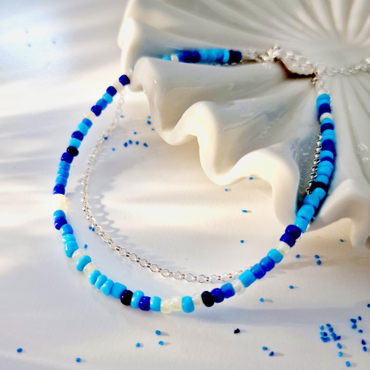 Bratara de picior – Scoica din adancuri – Argint 925 – Model 2 straturi cu lantisor si bilute albastre
