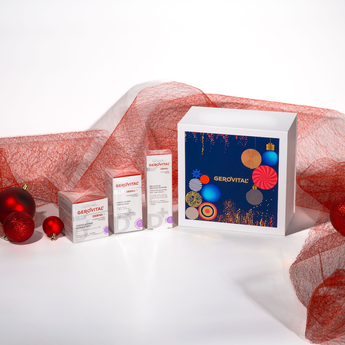 Set Cadou Dermatocosmetice Gerovital H3 Derma+: Cremă Antirid Contur Ochi, Ser Antiage Ceramide Booster și Cremă Antirid și Fermitate