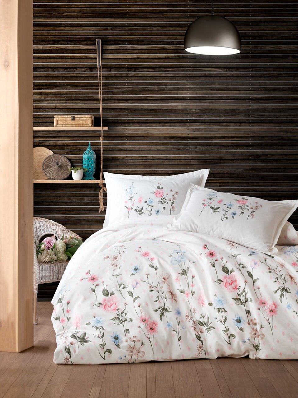 Lenjerie de pat dubla Super King (FR), 3 piese, Lessentiel Maison, Begona, Bumbac;Poliester, Alb / Roz / Verde