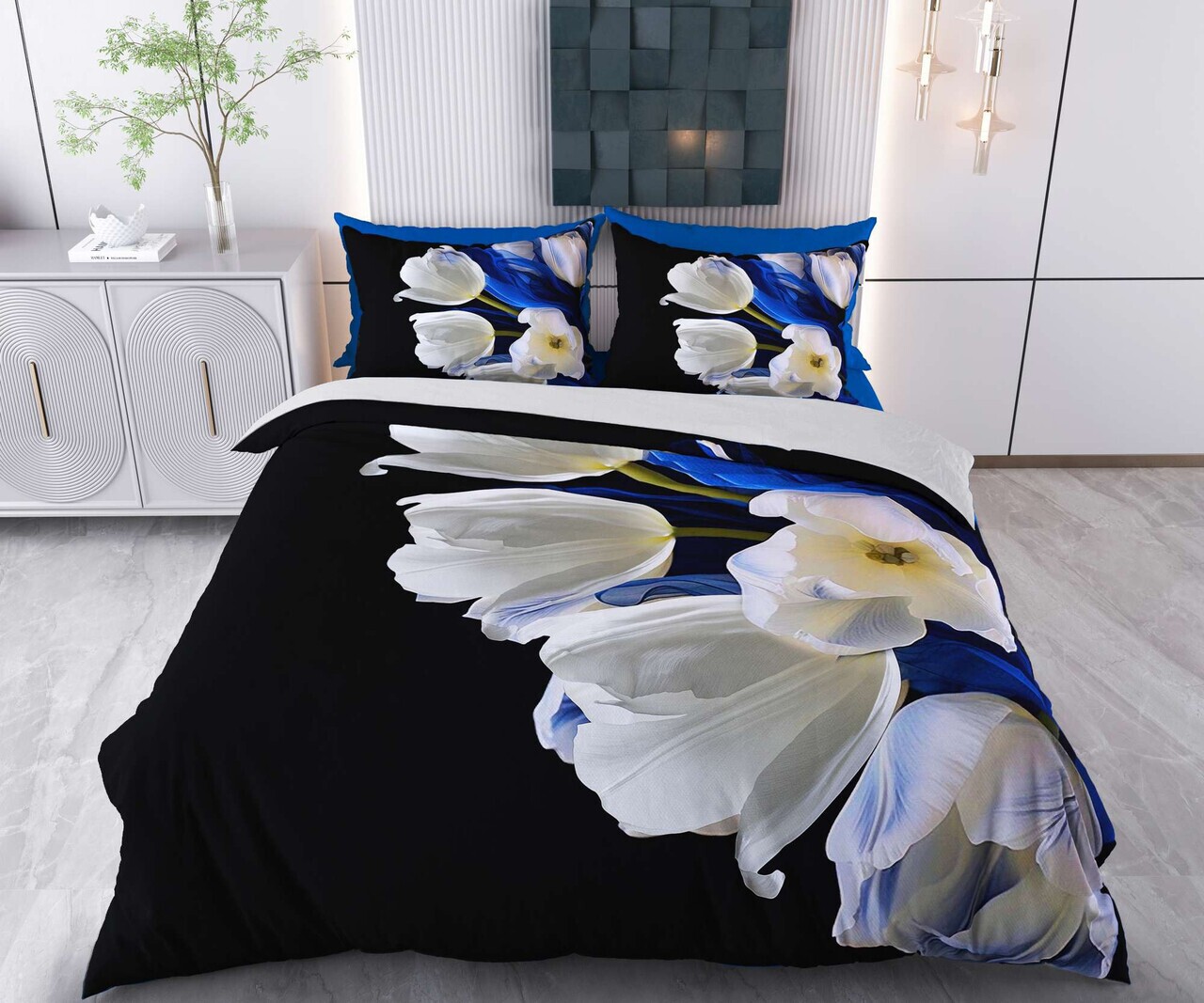 Lenjerie de pat dubla Super King (EU) (IT), 3 piese, Lessentiel Maison, Caspera, Bumbac;Poliester, Negru / Alb / Albastru închis