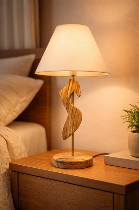 Lampa de masa handmade din lemn de maslin cu abajur textil