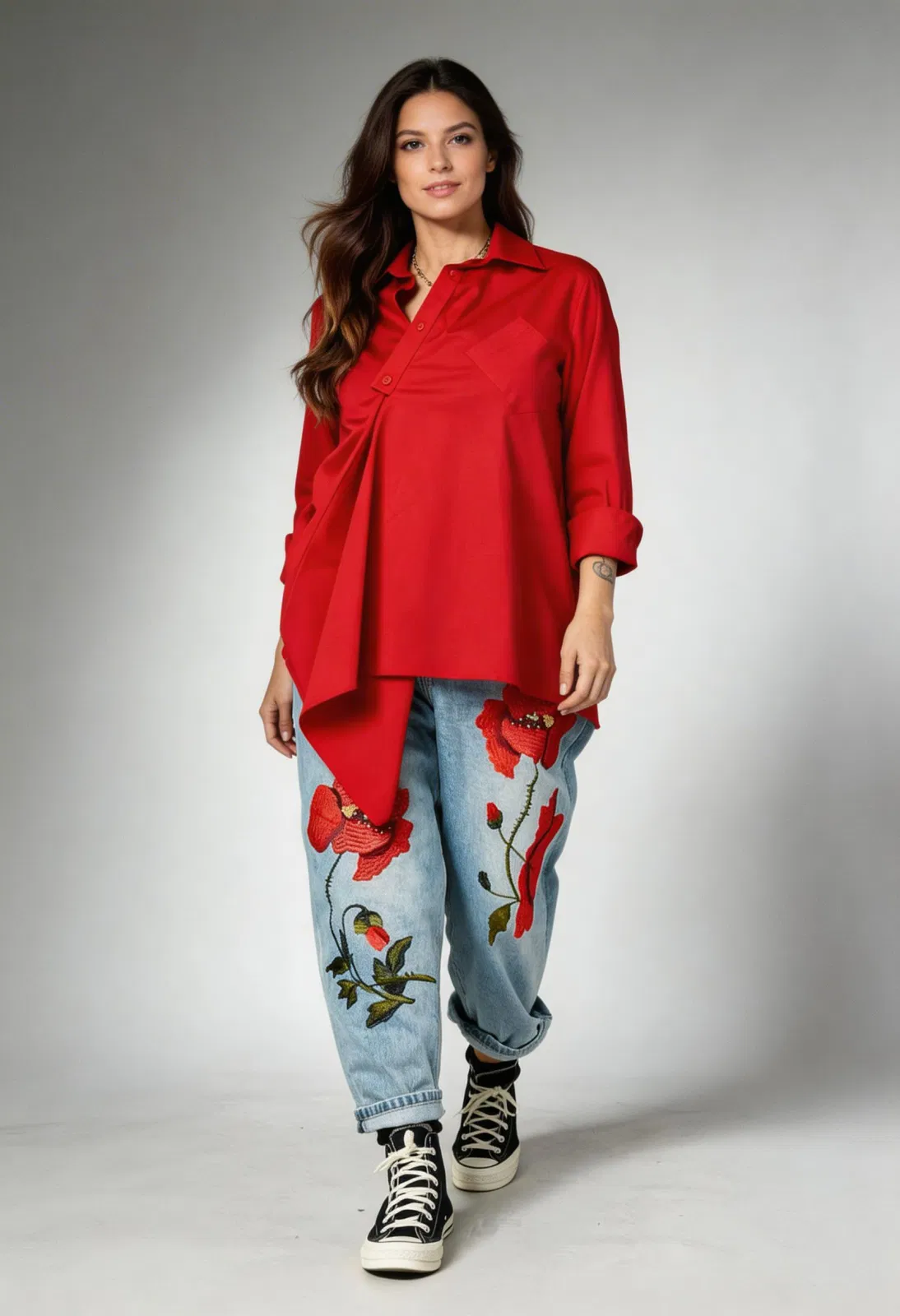 Camasa dama rosie asimetrica cu drapaj elegant si croi lejer premium Talie unica