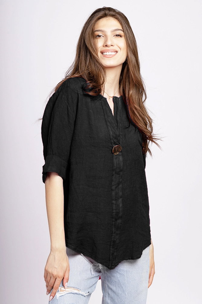 Camasa neagra din in cu nasture metalic decorativ Talie unica