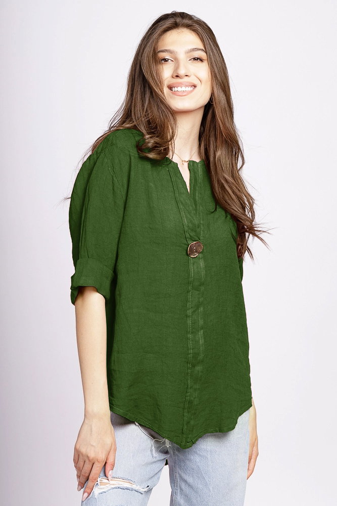 Camasa verde oliv din in cu nasture metalic decorativ Talie unica