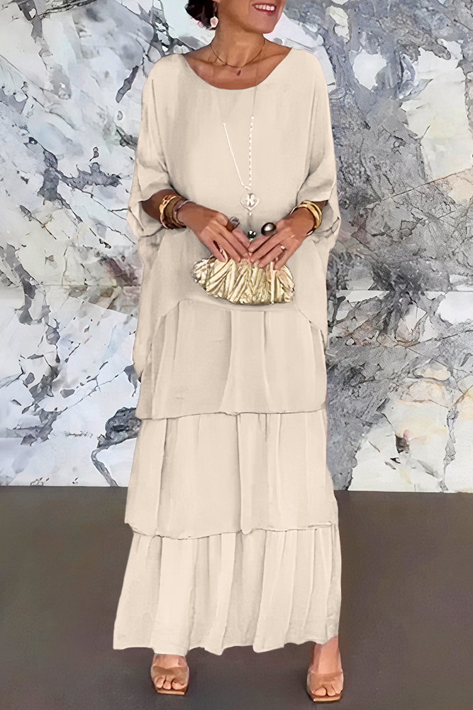 Rochie lunga suprapusa din matase si vascoza, cu trei volane mari si maneca cazuta, bej Talie unica