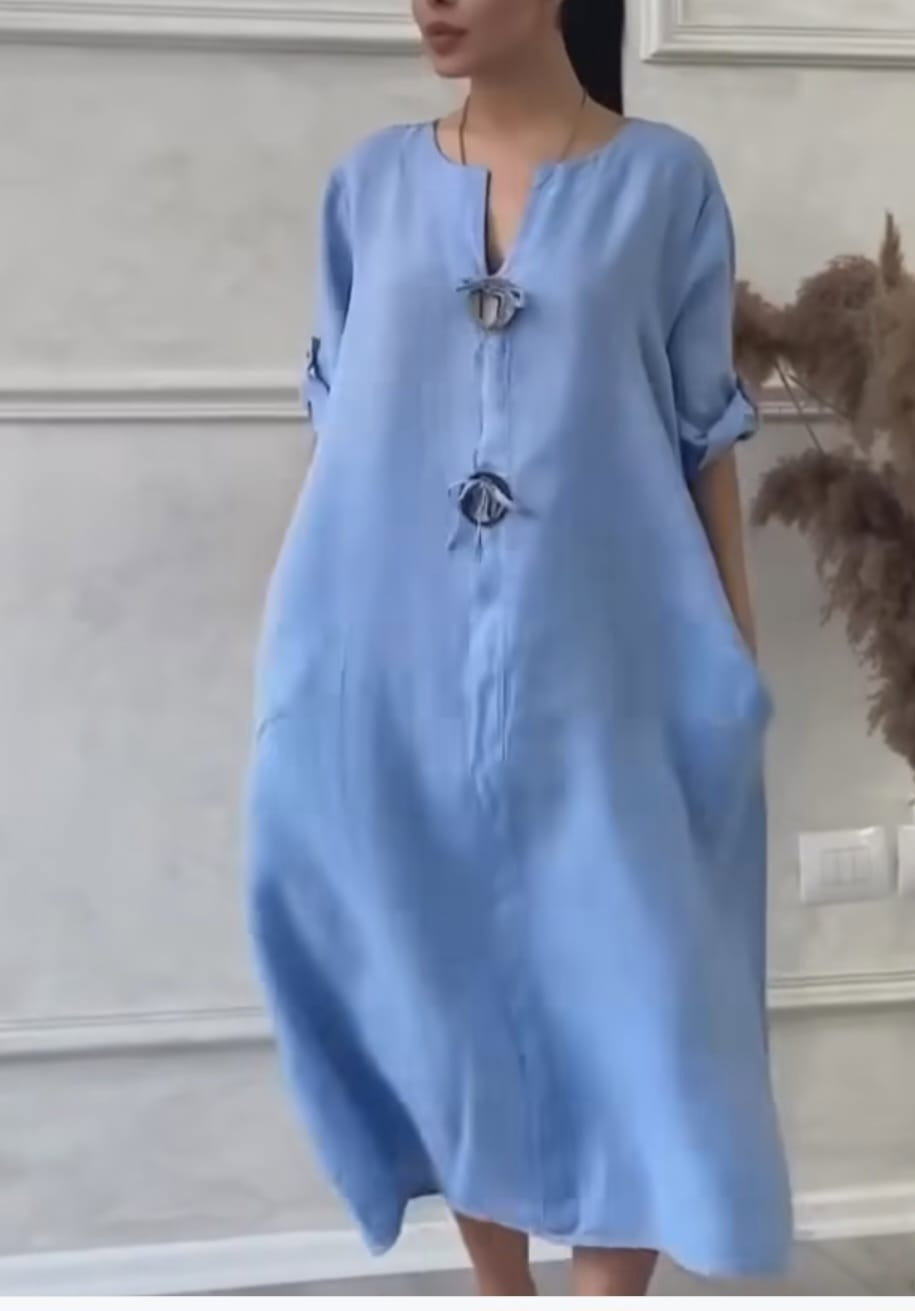 Rochie oversize din in, cu nasturi pe piept, albastru deschis Talie unica