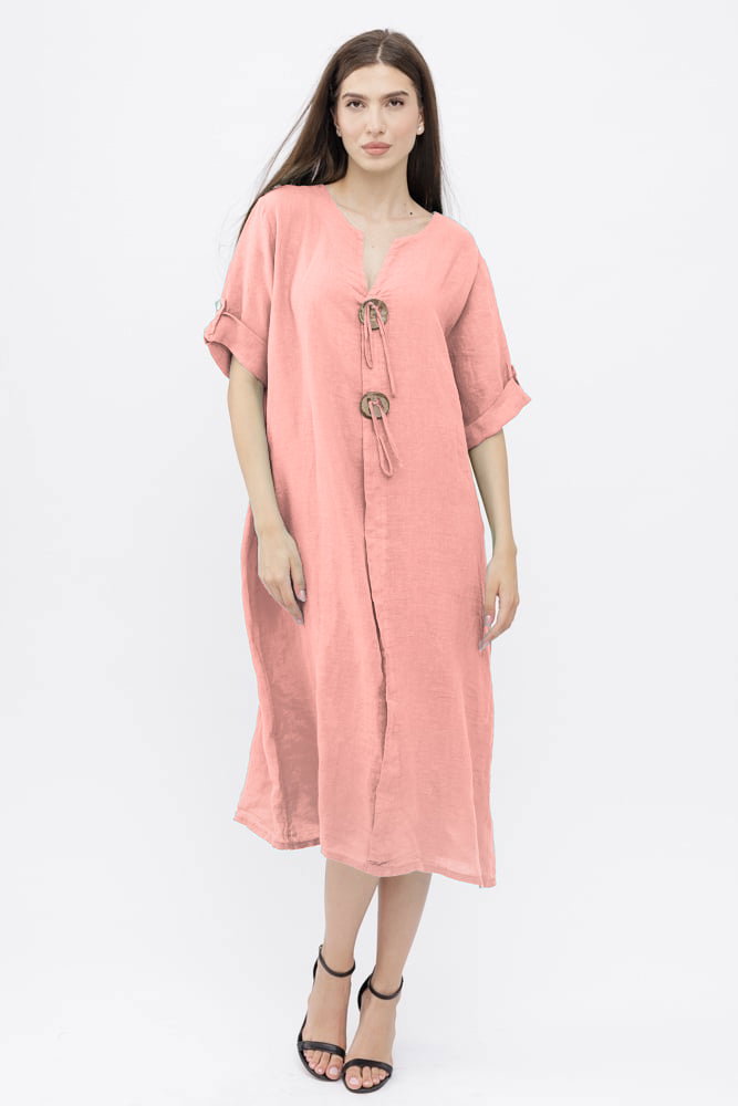Rochie oversize din in, cu nasturi pe piept, roz Talie unica