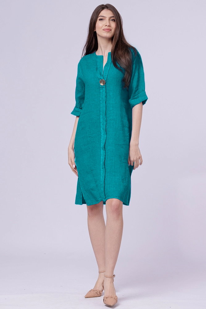 Rochie tunica din in turcoaz, cu nasture metalic decorativ Talie unica