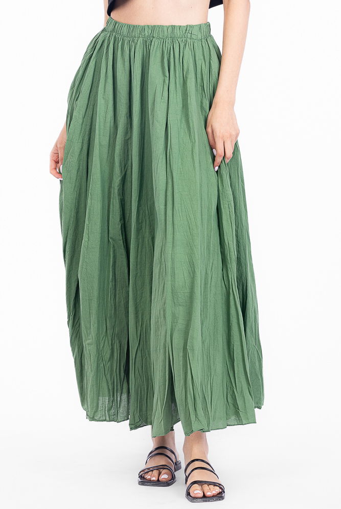 Fusta lunga, ampla, clos, din bumbac creponat, verde kaki deschis Talie unica