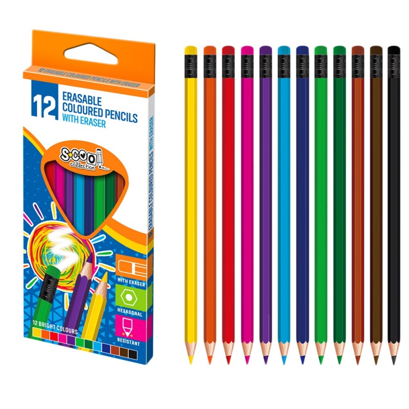 Creioane colorate cu radiera, forma hexagonala, mina rezistenta, set 12 bucati