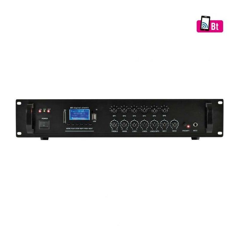 Mixer amplificator 120W, 6 canale, 100V/8 ohm, Bluetooth, FM, MP3, ecran LCD