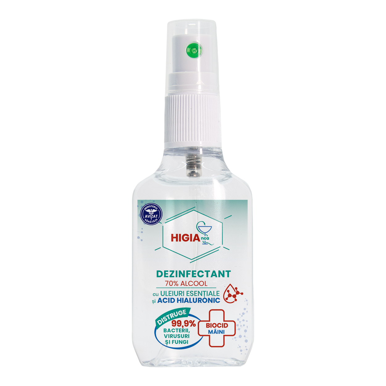 DEZINFECTANT SOLUȚIE 70% ALCOOL cu Uleiuri Esențiale și Acid Hialuronic - 50ml HIGIAnca