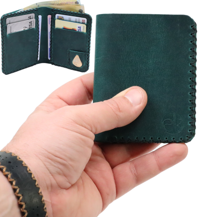 Portofel barbati din piele naturala, lucrat si cusut manual, Adam, Handmade, Verde-Inchis Kaki, Produs in Romania