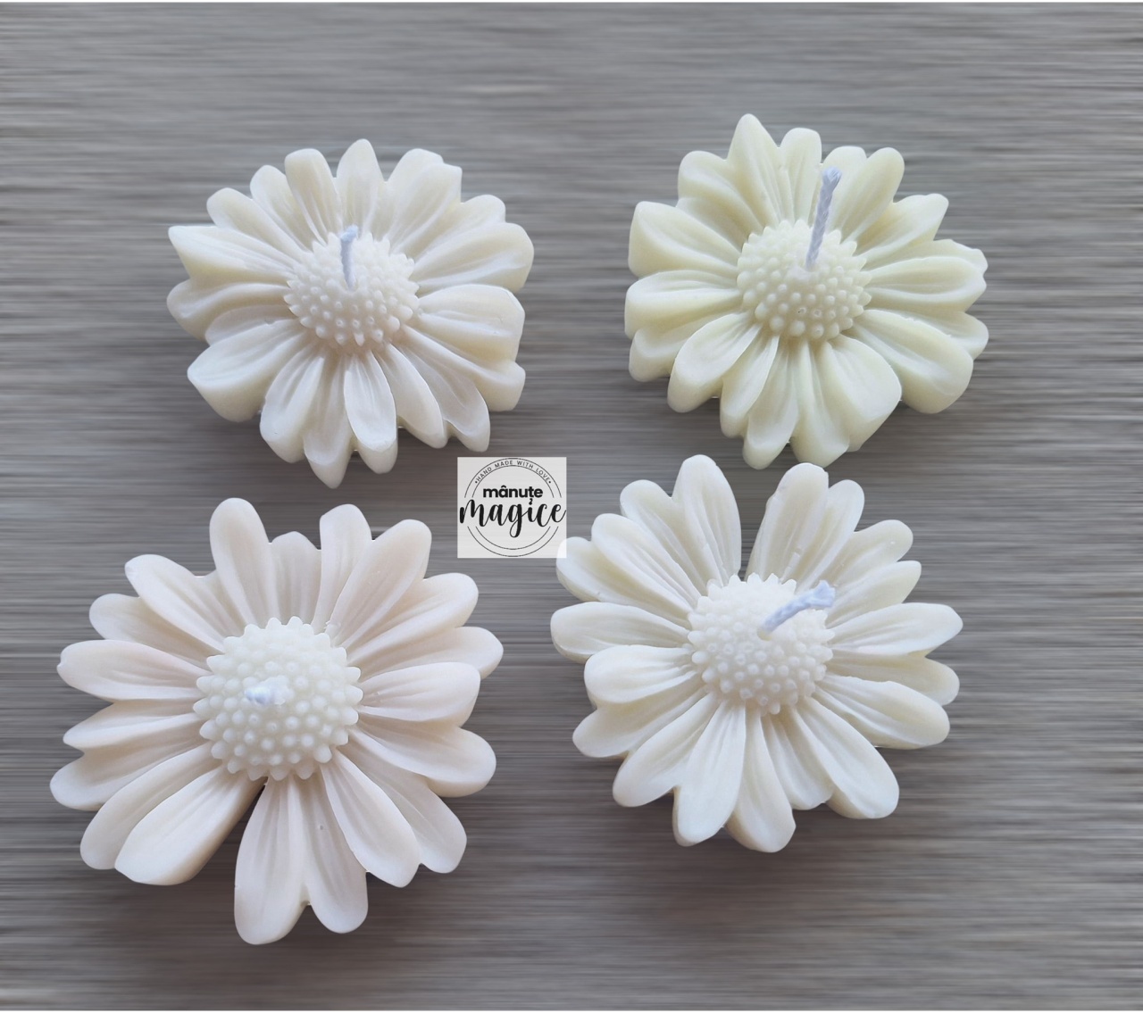 ? Lumânare artizanală – model Margaretă ? O lumânare delicată, turnată manual din ceară naturală de soia, în forma unei margarete pline de farmec. Simbol al purității, sincerității și noilor începuturi, este alegerea ideală pentru mărturii de nuntă, botez sau evenimente speciale . Fiecare lumânare este realizată cu grijă, iar la cerere poate fi ambalată în tull fin, saculet organza sau in cutie, cu fundiță și etichetă personalizată. ✨ Detalii: Ceară 100% naturală de soia Fitil cerat Diametru: aprox. 6 cm Ambalaj personalizat la cerere (tulle,saculet organza sau cutie + fundiță + etichetă)