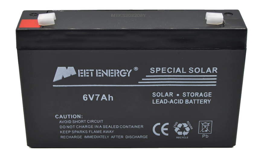 Baterie este destinata sistemelor fotovoltaice cu baterii (offgrid). Acumulatorul este fabricat din placi lamelare izolate prin tehnologia AGM si rezista la cicluri multiple de descarcare. Caracteristici: Tensiune: 6V Sarcina electrica: 7Ah Tensiune in repaus: 6.8-6.9V Tensiune in uz: 7.25-7.45V Curent incarcare: maxim 1A Sistem solar compatibil: fotovoltaic Dimensiuni(L x l x h): 15 x 9.5 x 3.5 cm