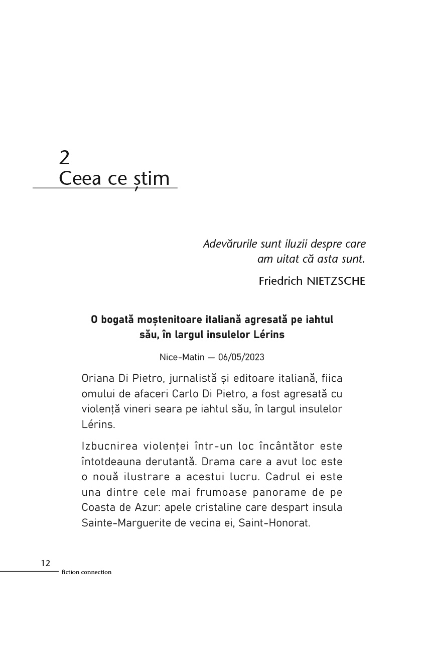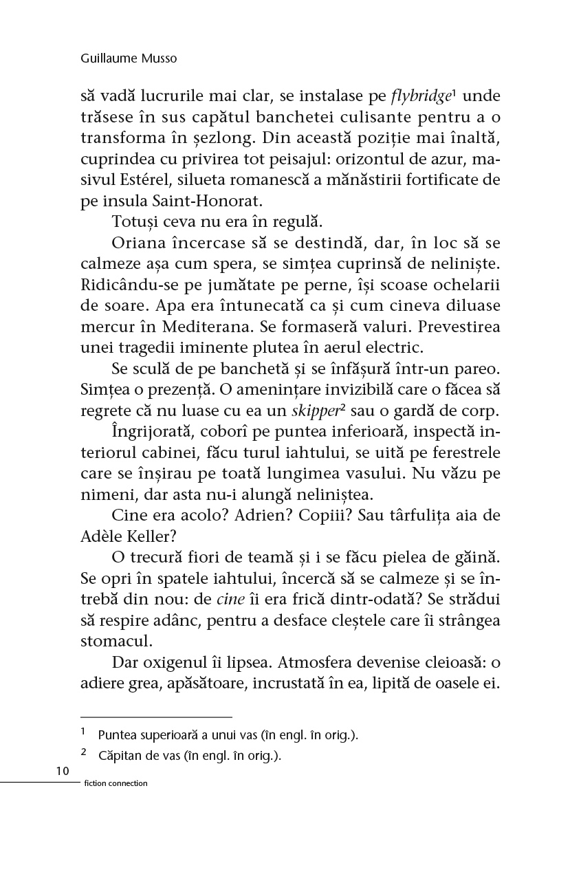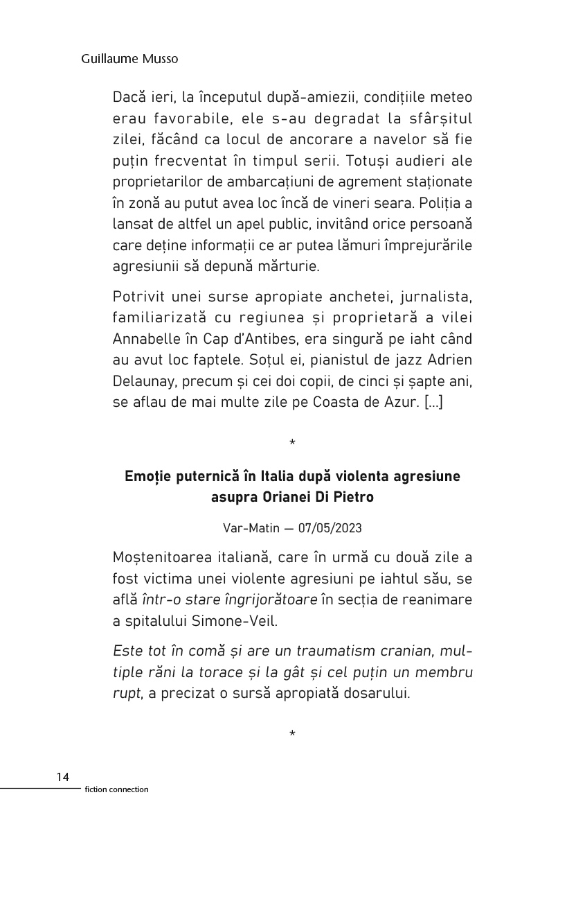 „Exista trei adevaruri: adevarul meu, adevarul tau si adevarul.“ Coasta de Azur – primavara anului 2023In largul statiunii Cannes, un iaht pluteste in deriva printre insulele Lerins. La bordul lui se afla Oriana Di Pietro, editoare italiana si mostenitoarea unei celebre familii milaneze. Agresata cu salbaticie, ea va muri dupa zece zile petrecute in coma.Cine a ucis-o pe Oriana?Un barbat si trei femei au fiecare o versiune proprie: Adrien, sotul victimei, un pianist de jazz seducator si misterios, enigmatica Adele, tanara lui amanta, Justine, politista insarcinata cu ancheta, si Oriana insasi, prin intermediul relatarii bulversante a ultimelor saptamani din viata ei.Nimeni nu minte. Dar nimeni nu are aceeasi parere in privinta adevarului…Fascinant si indraznet, acest thriller psihologic imprevizibil este unul dintre cele mai reusite romane ale lui Guillaume Musso.Nascut in 1974 in Antibes, pe Riviera Franceza, Guillaume Musso s-a indragostit de literatura de la o varsta frageda. Mare parte din timpul liber si-l petrecea citind carti de la biblioteca unde lucra mama lui, iar concursul de povestiri la care a participat in gimnaziu l-a ajutat sa descopere placerea scrisului, care nu l-a mai parasit de atunci. La 19 ani, a plecat in Statele Unite, unde a petrecut cateva luni la New York si in New Jersey, vanzand inghetata si locuind impreuna cu muncitori din diverse tari. Cu mintea doldora de povesti, s-a intors in Franta, si-a luat licenta in stiinte economice si a fost o vreme profesor. Cu carti traduse in 47 de limbi si vandute in peste 34 milioane de exemplare in intreaga lume, Musso este unul dintre cei mai apreciati autori francezi de thrillere. La Editura Trei, de acelasi autor au aparut romanele, Fata si noaptea, Viata secreta a scriitorilor, Viata e un roman, Necunoscuta din Sena si Angelique.
