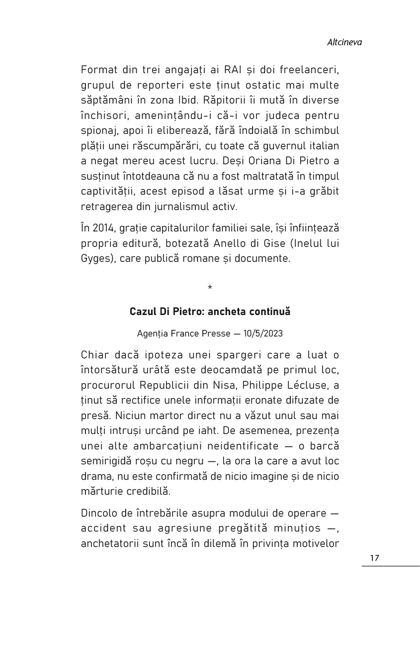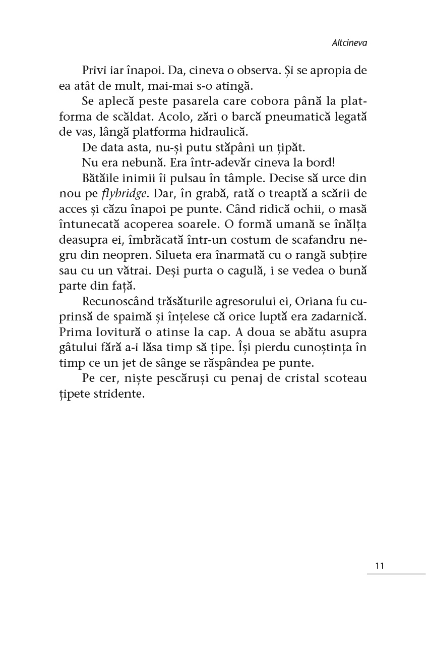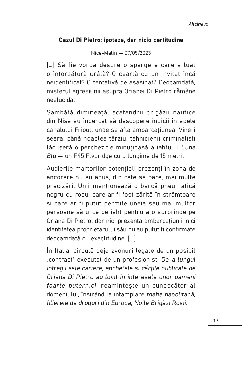 „Exista trei adevaruri: adevarul meu, adevarul tau si adevarul.“ Coasta de Azur – primavara anului 2023In largul statiunii Cannes, un iaht pluteste in deriva printre insulele Lerins. La bordul lui se afla Oriana Di Pietro, editoare italiana si mostenitoarea unei celebre familii milaneze. Agresata cu salbaticie, ea va muri dupa zece zile petrecute in coma.Cine a ucis-o pe Oriana?Un barbat si trei femei au fiecare o versiune proprie: Adrien, sotul victimei, un pianist de jazz seducator si misterios, enigmatica Adele, tanara lui amanta, Justine, politista insarcinata cu ancheta, si Oriana insasi, prin intermediul relatarii bulversante a ultimelor saptamani din viata ei.Nimeni nu minte. Dar nimeni nu are aceeasi parere in privinta adevarului…Fascinant si indraznet, acest thriller psihologic imprevizibil este unul dintre cele mai reusite romane ale lui Guillaume Musso.Nascut in 1974 in Antibes, pe Riviera Franceza, Guillaume Musso s-a indragostit de literatura de la o varsta frageda. Mare parte din timpul liber si-l petrecea citind carti de la biblioteca unde lucra mama lui, iar concursul de povestiri la care a participat in gimnaziu l-a ajutat sa descopere placerea scrisului, care nu l-a mai parasit de atunci. La 19 ani, a plecat in Statele Unite, unde a petrecut cateva luni la New York si in New Jersey, vanzand inghetata si locuind impreuna cu muncitori din diverse tari. Cu mintea doldora de povesti, s-a intors in Franta, si-a luat licenta in stiinte economice si a fost o vreme profesor. Cu carti traduse in 47 de limbi si vandute in peste 34 milioane de exemplare in intreaga lume, Musso este unul dintre cei mai apreciati autori francezi de thrillere. La Editura Trei, de acelasi autor au aparut romanele, Fata si noaptea, Viata secreta a scriitorilor, Viata e un roman, Necunoscuta din Sena si Angelique.