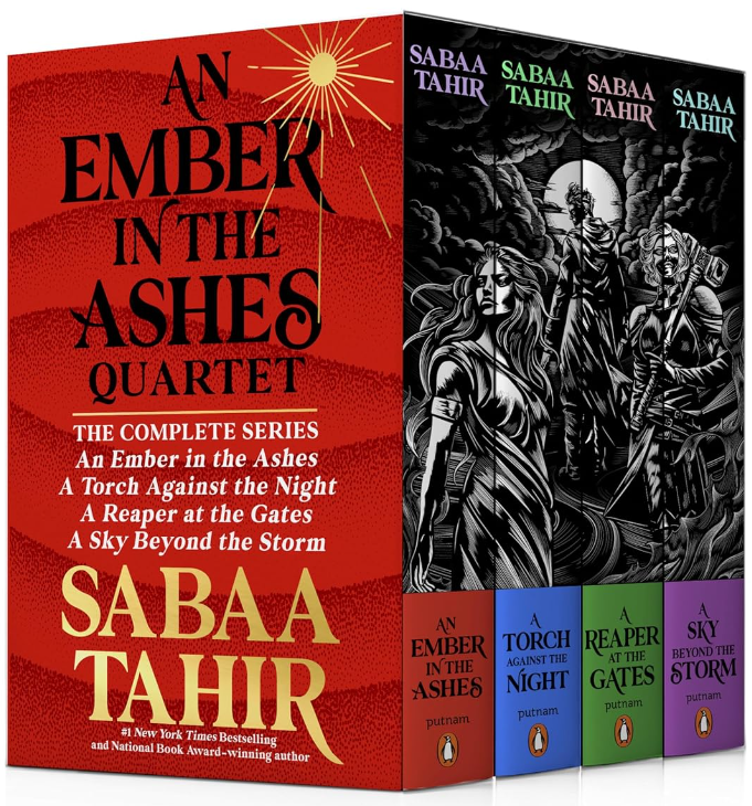 Journey to the ruthless and romantic world of Sabaa Tahir’s New York Times bestselling fantasy series, An Ember in the Ashes quartet, available as a stunning paperback box set for the first time!The perfect gift for any epic fantasy fan, this collectible paperback box set with a gorgeous new series look includes all four books of the beloved and bestselling Ember series.Bound into each book is a stunning character portrait!An Ember in the AshesSet in a rich, high-fantasy world inspired by ancient Rome, Laia is a slave fighting for her family, and Elias is a young soldier fighting for his freedom.A Torch Against the NightAfter the events of the Fourth Trial, Martial soldiers hunt the two fugitives as they flee the city and undertake a perilous journey through the heart of the Empire.A Reaper at the GatesAll Empires fall. Beyond the Martial Empire and within it, the threat of war looms ever larger.A Sky Beyond the StormPrepare for the jaw-dropping finale and discover: Who will survive the storm?