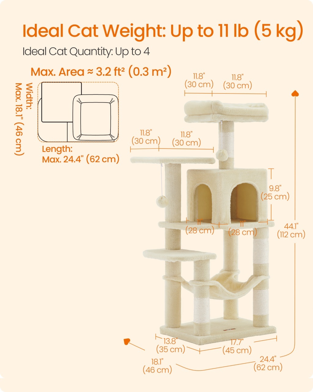 Ansamblu pisici Feandrea - Răsfăț pentru felinele tale Design modern și materiale de calitate Construit cu un design elegant și o nuanță beige rafinată, acest ansamblu pentru pisici nu doar că îmbunătățește estetic decorul casei tale, dar oferă și un loc de joacă ideal pentru micile tale feline. Realizat din PAL pluș moale, fiecare detaliu este gândit pentru a oferi confort și siguranță. Această combinație de materiale nu doar că asigură durabilitate , dar și o ambianță plăcută, perfectă pentru a răsfăța pisicile tale. Funcționalitate și organizare Acest ansamblu pentru pisici este mai mult decât un simplu loc de joacă; este un adevărat paradis pentru felinele tale. Cu 4 stâlpi de zgâriat care protejează mobilierul tău de unghii neastâmpărate, și cu 2 platforme și o peșteră confortabilă , fiecare pisică va găsi un loc perfect pentru a se relaxa sau a se juca. Datorită designului său multilevel , acest ansamblu este ideal pentru până la 4 pisici , fiecare având un loc dedicat pentru a se odihni și a se distra. Montaj și întreținere Montajul acestui ansamblu este o adevărată plăcere, datorită structurii sale simple și a uneltelor incluse , precum cheia Allen. Astfel, chiar și o singură persoană poate asambla cu ușurință acest produs. În plus, întreținerea este la fel de simplă; materialele utilizate, cum ar fi PAL-ul și plușul , pot fi curățate cu ușurință, asigurând un mediu curat și sănătos pentru pisicile tale. Nu uita să folosești sistemul de fixare în perete inclus pentru a asigura stabilitatea ansamblului. Comandă acum Nu mai aștepta! Oferă-le pisicilor tale un loc de joacă de vis și transformă-ți casa într-un adevărat paradis pentru feline . Detalii tehnice complete Dimensiuni și greutate Dimensiuni produs: 45 x 35 x 112 cm Greutate produs: 8.8 kg Capacitate maximă: 40 kg Materiale și caracteristici Material corp: PAL Material tapițerie/finisaj: Pluș Culoare: Beige Montaj și pachet Stare asamblare: Neasamblat Conținut pachet: 1 x Ansamblu pisici, Kit anti-răsturnare, Accesorii de montaj, Instrucțiuni Stil și origine Stil: Modern Destinație recomandată: Interior Informații importante Dacă pisica ta începe să roadă sau să mănânce pompoanele sau banda elastică, te rugăm să le îndepărtezi și să le ții departe de pisica ta pentru o perioadă. Dacă peștera pisicii este zgâriată și deteriorată de lăbuțele jucăușe, te rugăm să o repari sau să o înlocuiești înainte de utilizare pentru a evita riscurile de accidentare. Deoarece pisicile adoră să sară și să se joace, te rugăm să fixezi ansamblul de perete cu kitul anti-răsturnare inclus pentru utilizare în siguranță.