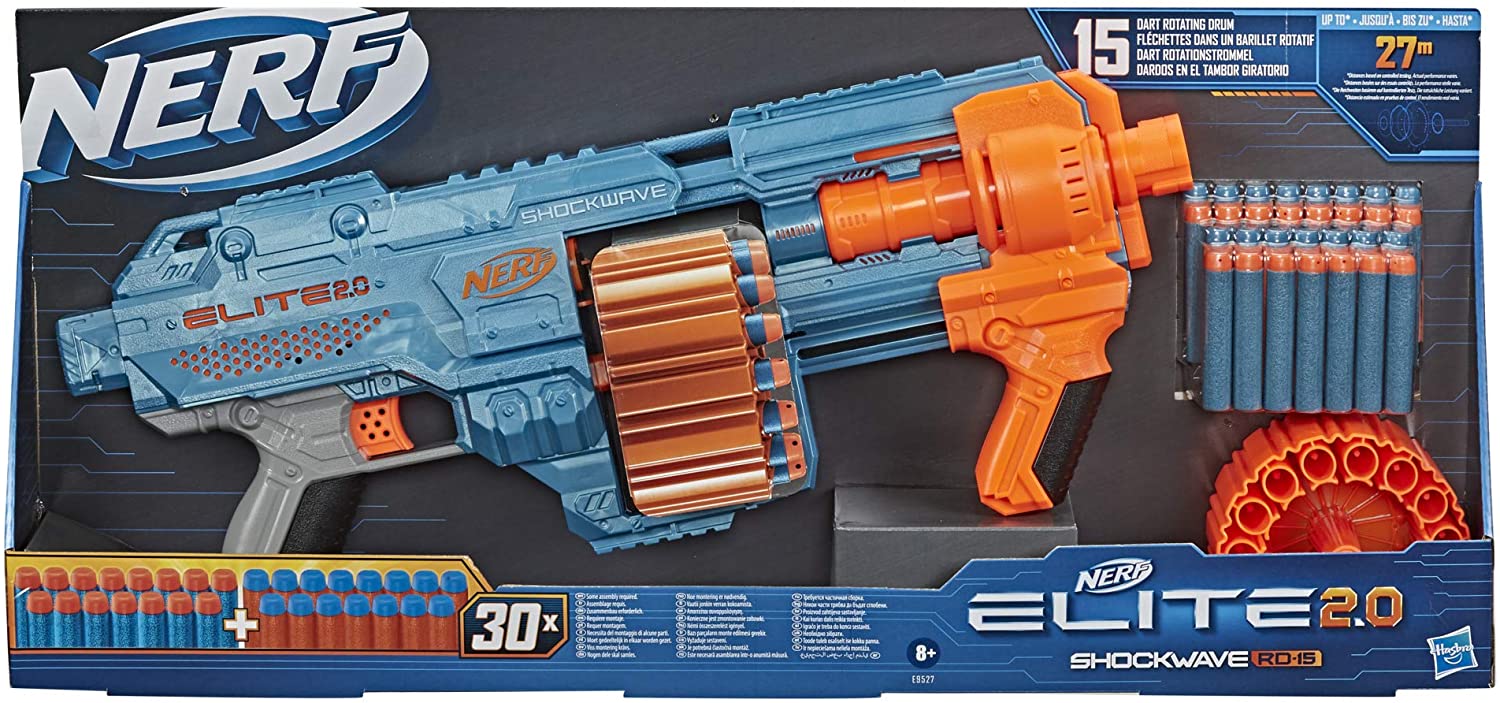 Pregateste-te pentru lupta cu blasterele Nerf Elite 2.0 care dispun de capabilitati de personalizare incorporate, astfel incat sa le poti face upgrade si sa profite de avantajul competitiilor Nerf. Construiti-va stocul de blaster-uri Nerf Elite 2.0 pentru a va optimiza strategia de joc si pentru a aduce performanta tactica si flexibilitate in fiecare misiune si lupta!Blasterul Nerf Elite 2.0 Shockwave RD-15 are capacitati de personalizare care includ avantaje tactice, punct de atasare a tevii si punct de atasare stoc pentru a optimiza pentru lupta. Acest blaster cu pompa de actiune are un tambur rotativ de 15 sageti pentru a va roti tintele. Trageti glisa de amorsare inapoi si apasati pe tragaci pentru a dezlantui, lansa 1 sageata. Puteti trage 15 sageti la rand inainte sa fie timpul sa reincarcati. Include 30 de sageti oficiale Nerf - 15 pentru tambur si 15 pentru reincarcari.Contraindicat copiilor mai mici de 3 ani. Jucaria/produsul poate contine piese mici care se pot inghiti sau inhala existand pericolul de sufocare sau nu este potrivita copiilor mai mici de 3 ani. Nu lasati ambalajele jucariilor/produselor la indemana copiilor. Indepartati orice ambalaj al jucariei/produsului inainte de a da jucaria/produsul copilului. Va rugam sa supravegheati copilul in timp ce se joaca/foloseste acest produs. Pastrati instructiunile si etichetele pentru referinte viitoare. Pastrati jucaria/produsul departe de foc; feriti jucaria/produsul de temperaturi ridicate si umiditate.