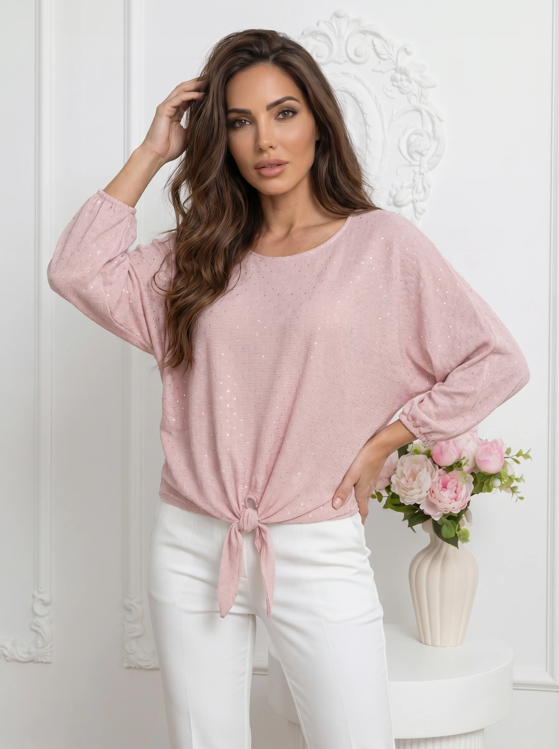 Bluza eleganta roz pudra cu strasuri stralucitoare, o piesa vestimentara cu adevarat speciala, decorata cu o multime de strasuri care capteaza lumina si ofera un efect spectaculos. Aceasta bluza are un croi lejer si confortabil, cu maneci 3/4si un decolte