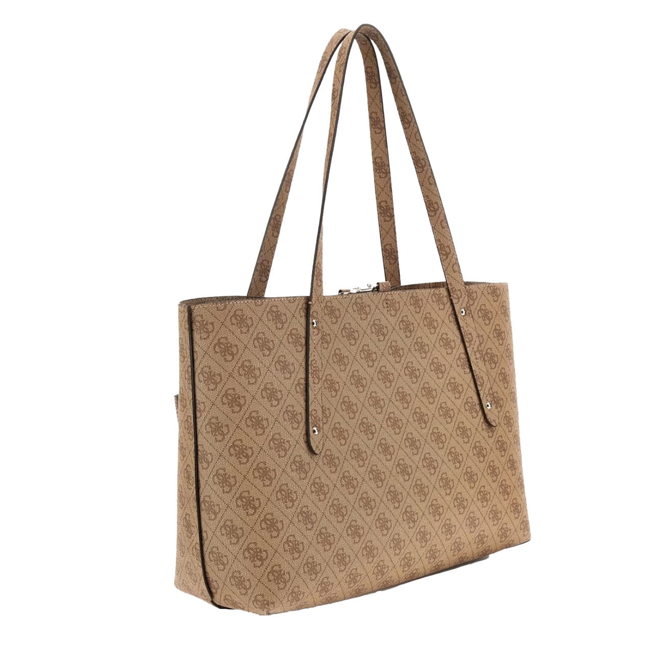Geanta de mână Guess este realizată integral din poliuretan și se distinge prin imprimeul său monogramat cu logo-ul 4G repetitiv, emblematic pentru brand. Setul conține două genți asortate: o geantă tip shopper de mari dimensiuni, ideală pentru activitățile de zi cu zi, și o geantă de tip pouch cu curea detașabilă, perfectă pentru utilizare individuală sau ca organizator interior.
