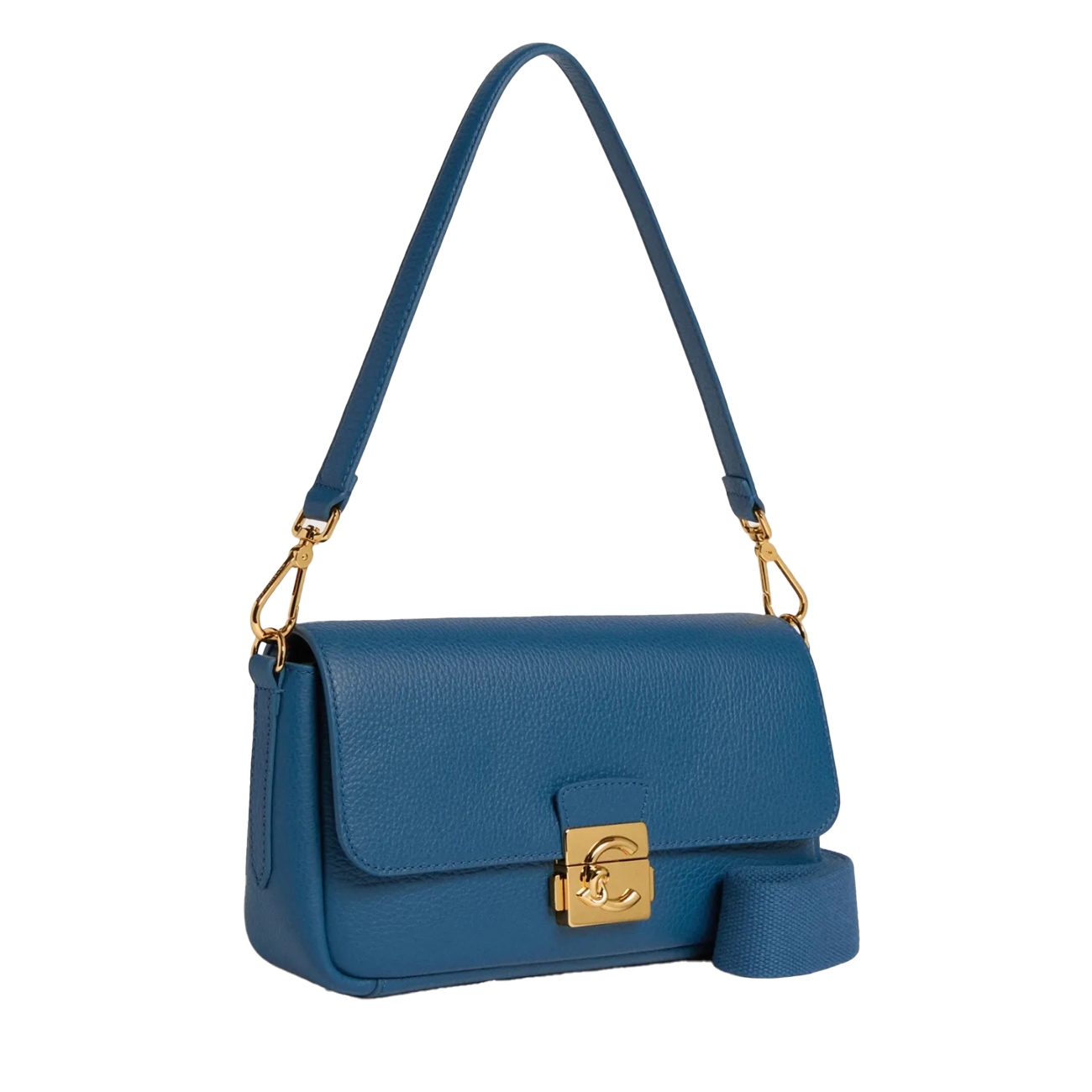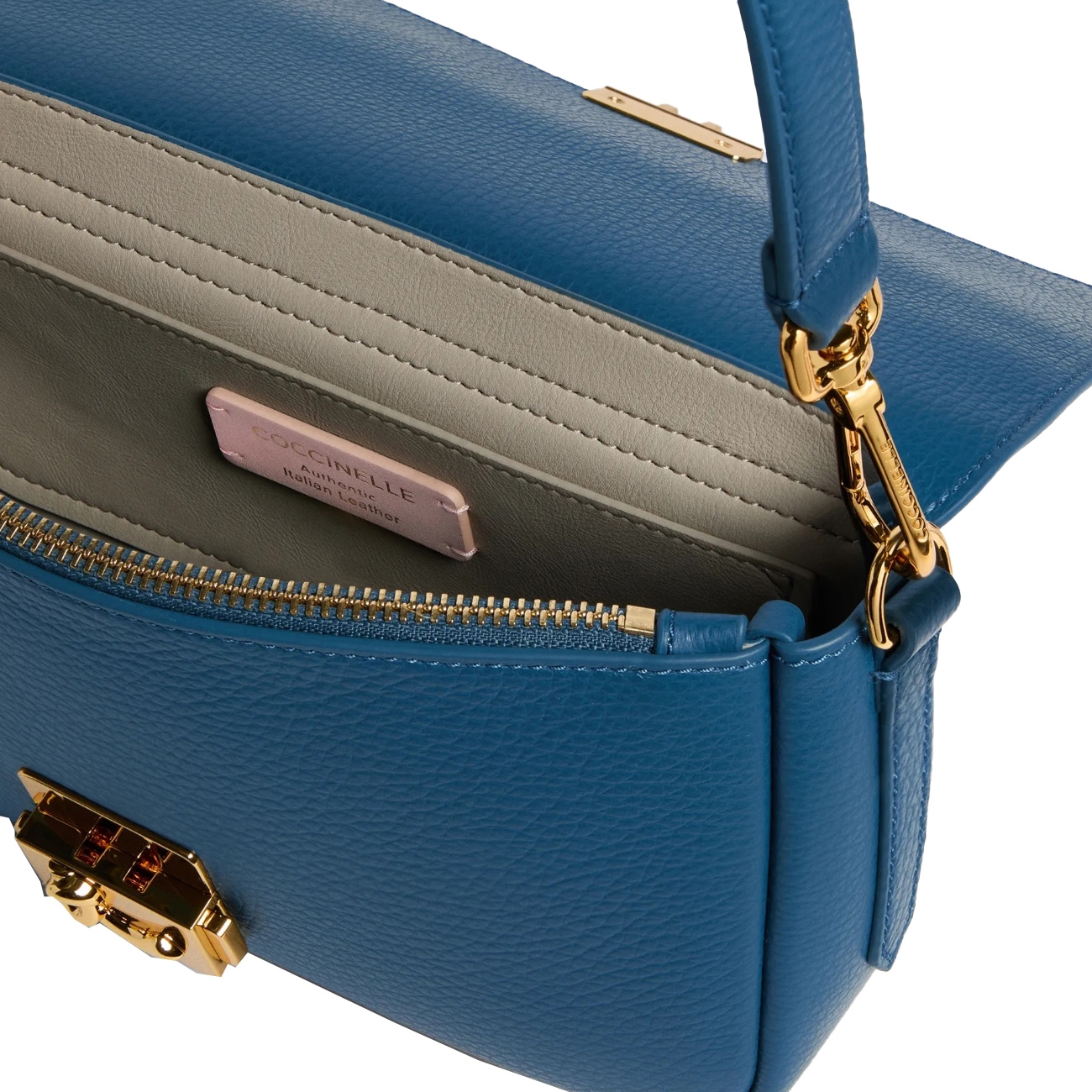 C-Me Lock Medium reinterpretă logo-ul emblematic într-o închidere modernă, cu un design echilibrat și funcțional. Realizată din piele embosată, rezistentă și ușor de întreținut, este potrivită pentru purtare zilnică. Silueta structurată este completată de detalii metalice cu finisaj auriu și de închiderea Tuck Lock cu butoane laterale. Mânerul detașabil și cureaua textilă reglabilă permit purtarea pe umăr sau crossbody, iar interiorul cu două buzunare, dintre care unul cu fermoar, asigură organizare practică.