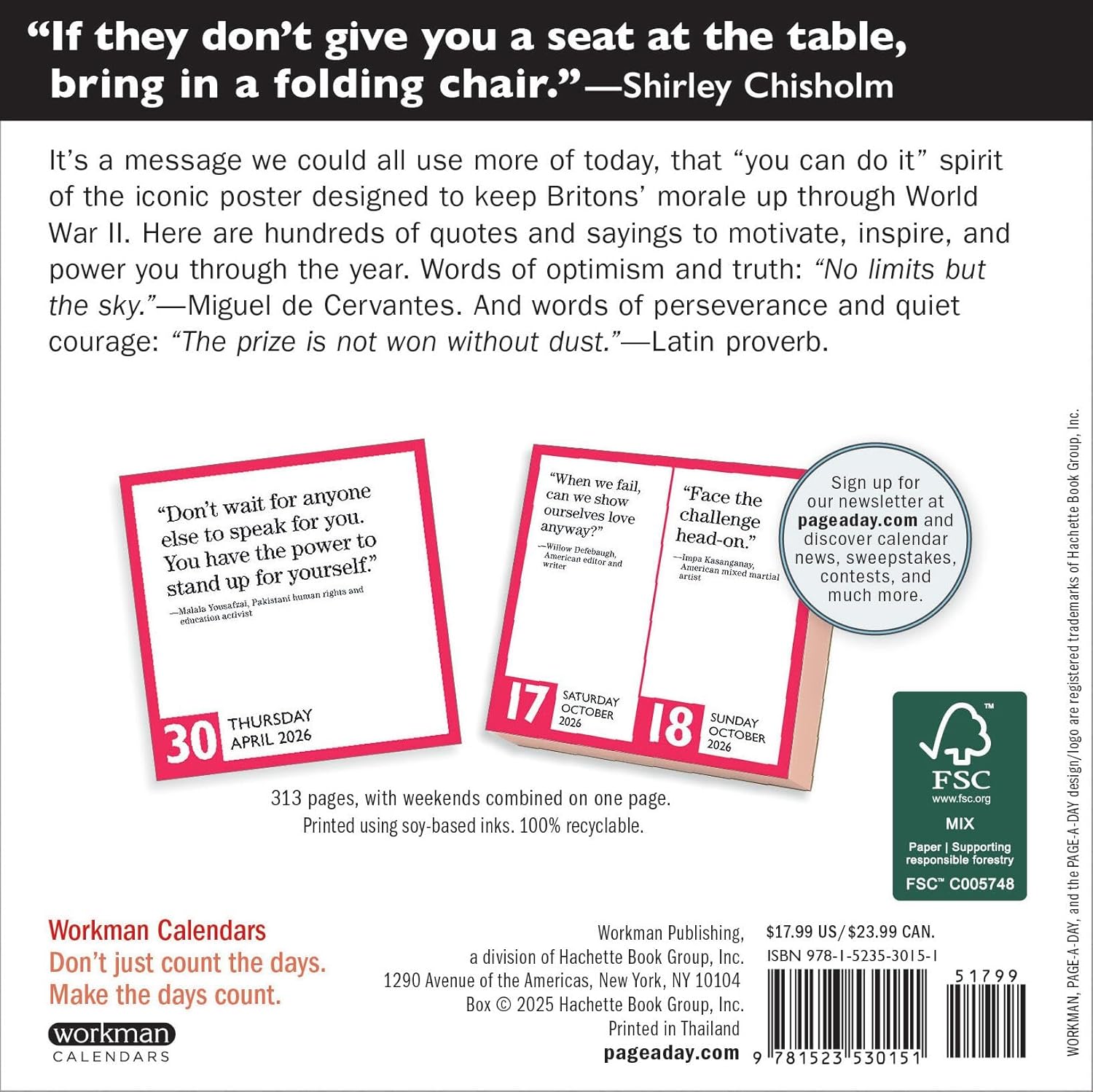 Calendar 2026 - Keep Calm and Carry On Page-A-DaySTIFF UPPER LIP: We could all use more of the you can do it spirit of the iconic poster designed to keep Britons morale up through World War II. This calendar contains hundreds of quotes and sayings to motivate, inspire, and power you throughout the year.GIFT POSITIVITY: With words of perseverance, optimism, truth, and quiet courage, this calendar will bring encouragement and strength to any desk.NOW PLASTIC-FREE!: Page-A-Day® Calendars are environmentally friendly! Printed on responsibly sourced paper and 100% recyclable, with sturdy cardboard backers.