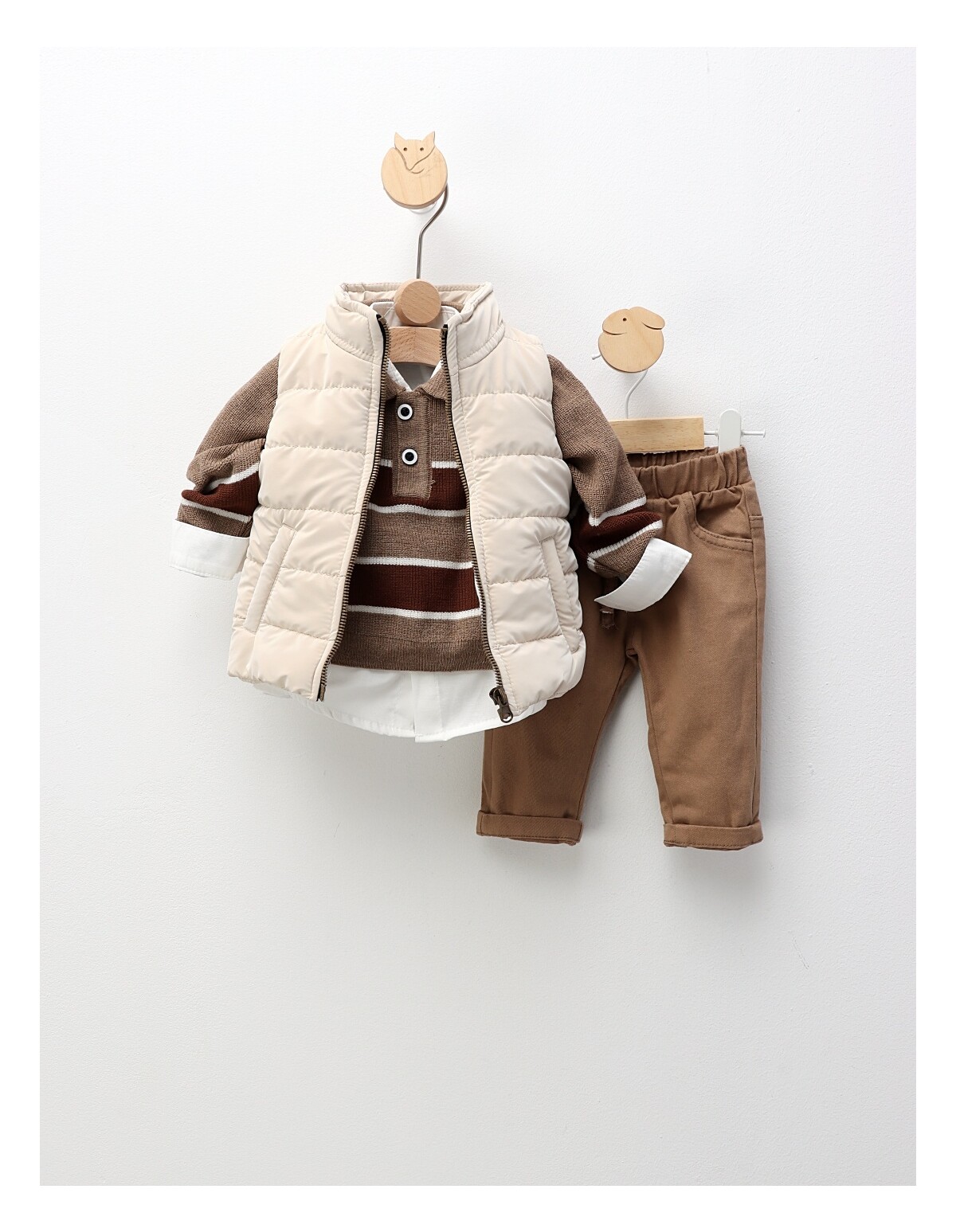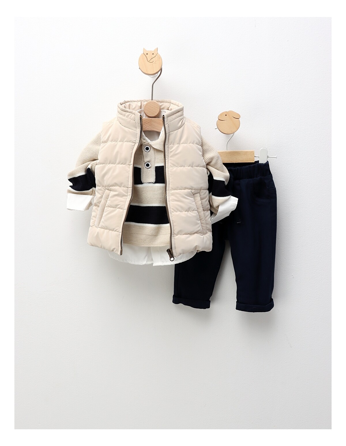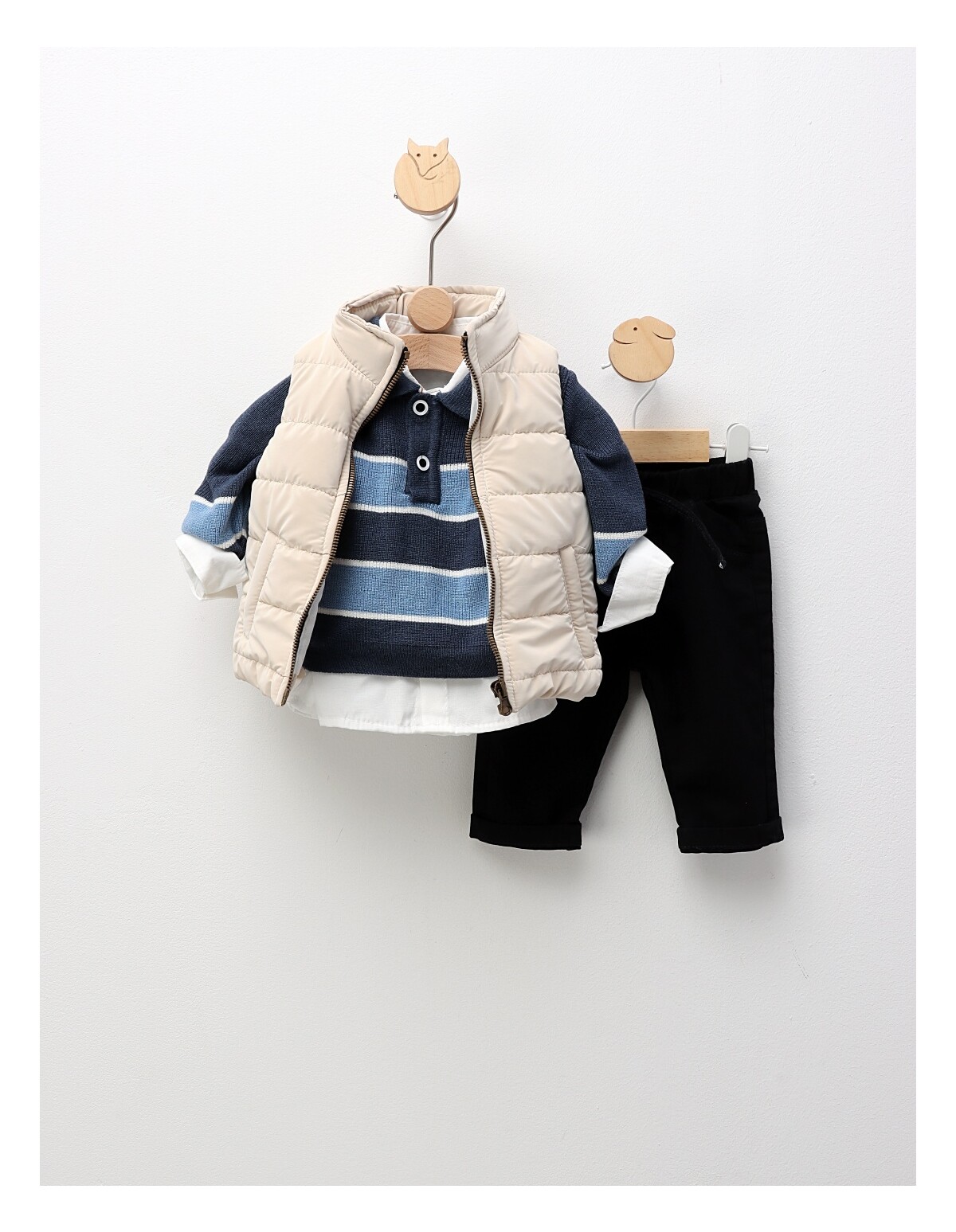 Îmbracă-ți băiețelul în acest costumas elegant și adorabil, perfect pentru orice ocazie specială! Setul include o salopetă cu bretele, care oferă un aspect stylish și confortabil. Bluzita asortată, echipată cu un papion drăgălaș, adaugă o notă de sofisticare și rafinament. Băscuța completează perfect look-ul, fiind un detaliu adorabil care va face ca micuțul tău să iasă în evidență. Confeționat din 100% bumbac de calitate superioară, acest costumas asigură o senzație plăcută și respirabilitate pentru pielea delicată a bebelușului. Disponibil în mărimile de la 3 la 12 luni, acest set este alegerea ideală pentru a transforma fiecare eveniment într-o experiență memorabilă!