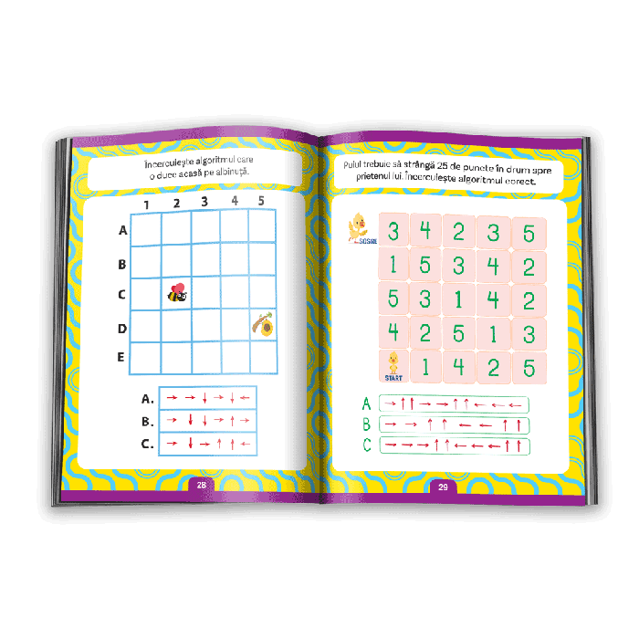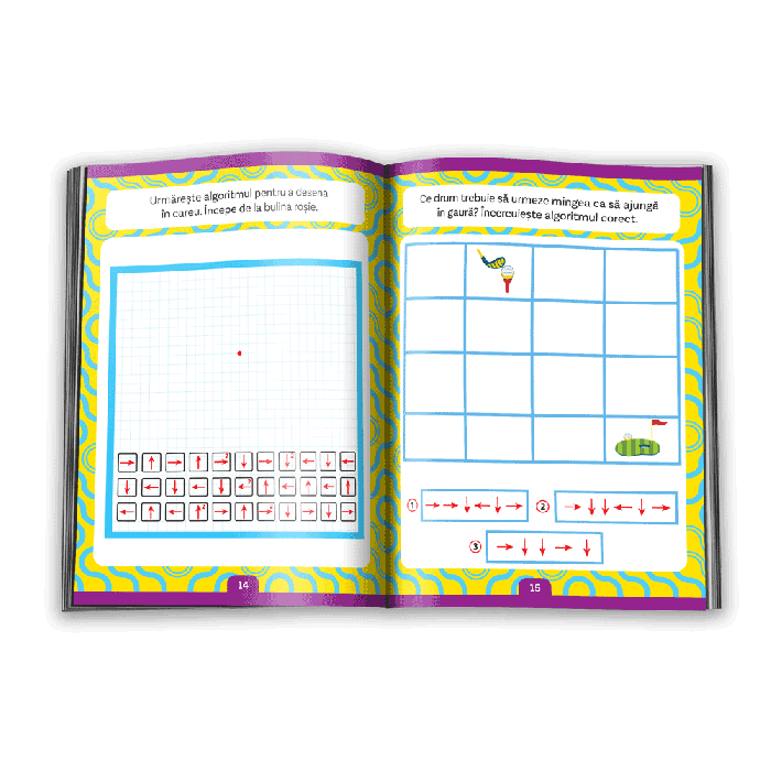 „CREEAZA PRIMII ALGORITMI!” contine activitati in care copilul isi va folosi atat cunostintele matematice, cat si logica si orientarea in spatiu. El va trebui sa elaboreze algoritmi care sa indeplineasca anumite cerinte, sa verifice si sa aleaga algoritmii corecti, sa deseneze urmarind algoritmii indicati si sa rescrie trasee sub forma de algoritmi.