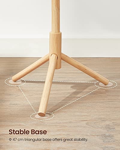 Durabil si revigorant: Fabricat din lemn masiv cu diametrul de 3,8 cm, acest cuier este durabil pentru multi ani de acum incolo. In plus, culoarea naturala adauga o nota revigoranta casei dvs. Inaltime reglabila pentru diferite nevoi: Designul cu 3 sectiuni va permite sa decideti inaltimea cuierului pentru haine. Pentru copii, doar 1-2 sectiuni sunt suficiente; pentru adulti, instalati toate cele 3 sectiuni Baza triunghiulara stabila: Stabilitatea este principala prioritate pentru un cuier. Baza triunghiulara cu latimea de 47 cm ofera o baza solida pentru acest cuier, care poate sustine pana la 15 kg. Economie de spatiu si rezistenta: Acest cuier de 47 x 47 x 175 cm se potriveste chiar si in holurile inguste si suporta o incarcatura grea. Cele 8 carlige (incarcatura de 1,5 kg per carlig) pot fi folosite pentru agatarea hainelor, gentilor si esarfele Asamblare usoara: Ingrijorat de asamblarea complicata? Relaxati-va. Structura simpla, piesele etichetate si instructiunile usor de urmat va vor ajuta sa terminati asamblarea fara efort.