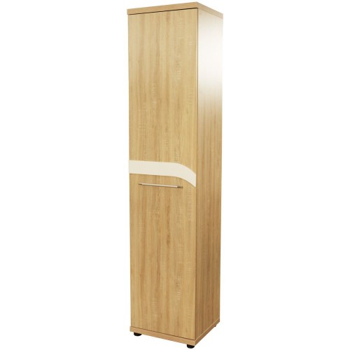 Dulap Sigma 1 usa. Dimensiuni (l x h x a): 450 x 2027 x 409 mm Culoare: Sonoma cu MDF alb. Materiale folosite: Carcasa si usa din pal melaminat, MDF. Descriere: Usa se poate monta la alegere, sa se deschida spre stanga ori spre dreapta. *Nota: Schita de montaj nu se afla in interiorul coletului intre piesele de mobila. Schita de montaj o sa fie atasata pe spatele facturii.