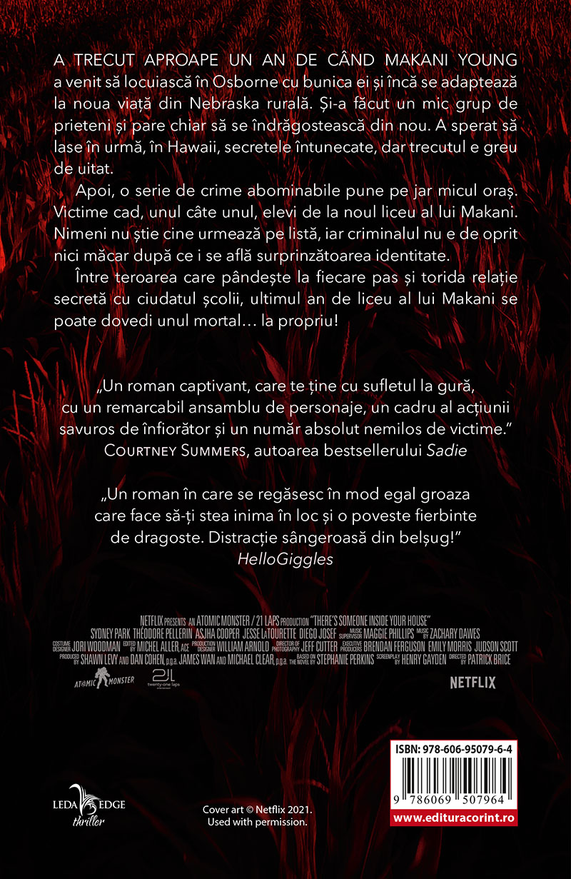 A trecut aproape un an de când Makani Young a venit să locuiască în Osborne cu bunica ei și încă se adaptează la noua viață din Nebraska rurală. Și-a făcut un mic grup de prieteni și pare chiar să se îndrăgostească din nou. A sperat să lase în urmă, în Hawaii, secretele întunecate, dar trecutul e greu de uitat. Apoi, o serie de crime abominabile pune pe jar micul oraș. Victime cad, unul câte unul, elevi de la noul liceu al lui Makani. Nimeni nu știe cine urmează pe listă, iar criminalul nu e de oprit nici măcar după ce i se află surprinzătoarea identitate. Între teroarea care pândește la fiecare pas și torida relație secretă cu ciudatul școlii, ultimul an de liceu al lui Makani se poate dovedi unul mortal… la propriu! „Un roman captivant, care te ține cu sufletul la gură, cu un remarcabil ansamblu de personaje, un cadru al acțiunii savuros de înfiorător și un număr absolut nemilos de victime.” Courtney Summers, autoarea bestsellerului Sadie „Un roman în care se regăsesc în mod egal groaza care face să-ți stea inima în loc și o poveste fierbinte de dragoste. Distracție sângeroasă din belșug!” HelloGiggles „O poveste alertă care te bagă în sperieți și te va face să dai rapid pagină după pagină ca să vezi ce se întâmplă mai departe.” BuzzFeed „Povestea de dragoste și crimele îngrozitoare își dau întâlnire pe bancheta din spate a mașinii, creând o lectură pe cât de stranie, pe atât de încântătoare.” Associated Press