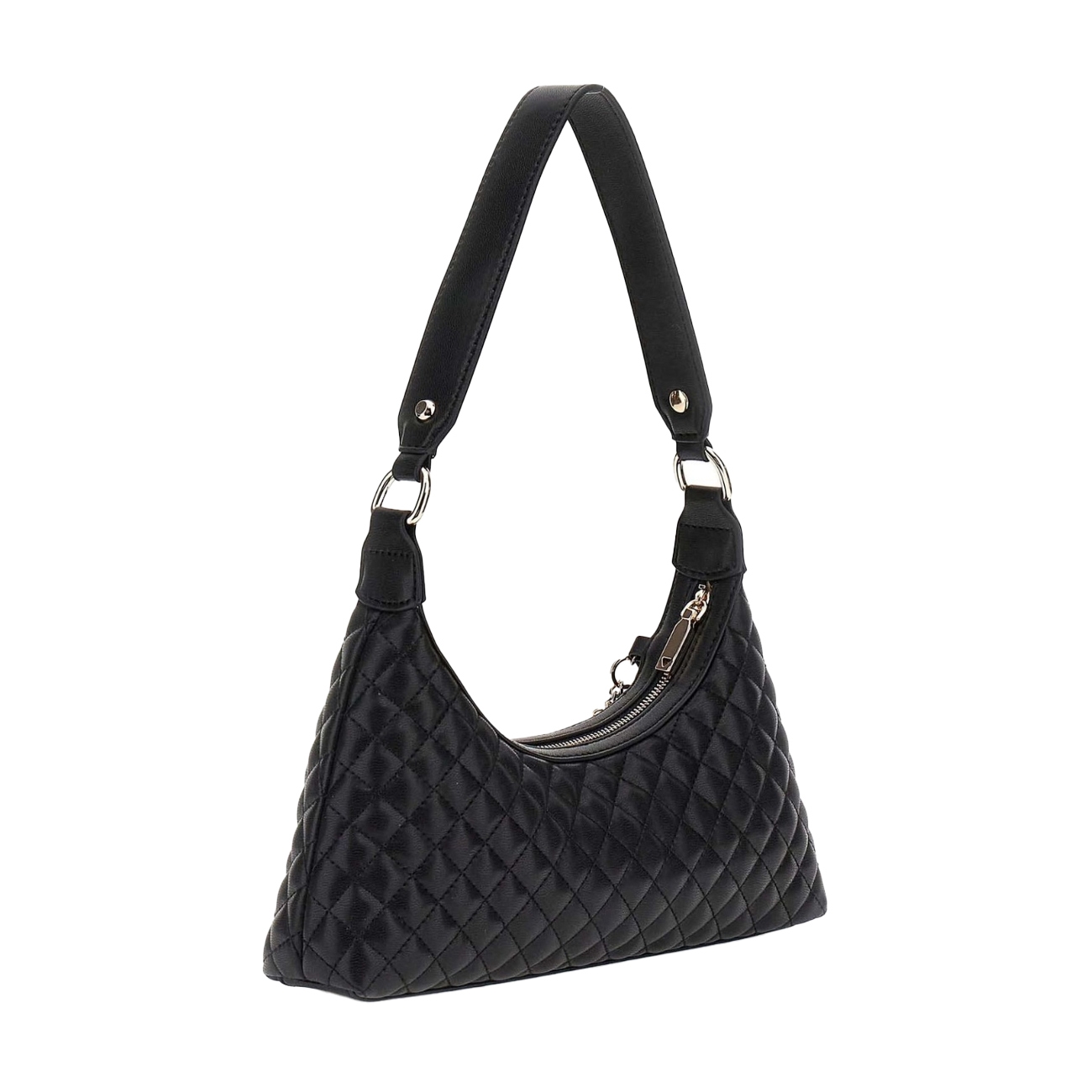 Geanta de umăr Everlee Charm Appliqué de la Guess impresionează prin designul său feminin și detaliile luxoase. Construită din material sintetic matlasat, cu o textură plăcută la atingere, această geantă reușește să combine eleganța cu un aer jucăuș datorită lanțului decorativ cu brelocuri strălucitoare. Logo-ul triunghiular Guess metalic accentuează partea frontală, oferind un plus de recunoaștere brandului. Închiderea cu fermoar asigură acces facil și sigur la interiorul practic, suficient de spațios pentru obiectele esențiale de zi cu zi. Cureaua de umăr oferă confort și versatilitate, fiind potrivită atât pentru ținutele casual, cât și pentru cele elegante.