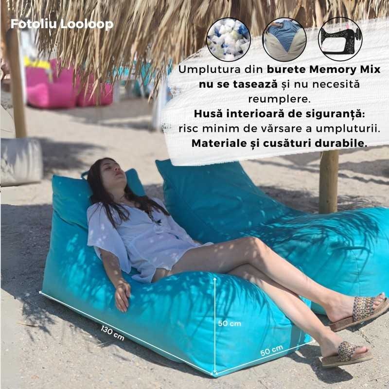 Fotoliu Looloop Verde Tuborg – fotoliu puf ergonomic cu formă unică Fotoliul Looloop Verde Tuborg este un fotoliu puf cu design inovator, creat pentru relaxare în aer liber sau interior. Forma sa ergonomică și alungită oferă suport confortabil pentru întregul corp, iar umplutura cu fulgi de burete memory mix se adaptează perfect poziției tale. Husa din material impermeabil, detașabilă și lavabilă, îl face ideal pentru plajă, grădină, terasă, balcon sau living. De ce să alegi acest model? Material impermeabil rezistent – protecție UV și rezistență, ideal și pentru exterior Design ergonomic unic – formă alungită care susține confortabil întregul corp Fulgi de burete memory mix – se adaptează poziției corpului pentru confort maxim Husă detașabilă și lavabilă – se spală la mașina de spălat la 30°C Versatil – potrivit atât pentru interior, cât și pentru exterior Fabricat în România – produs Pufrelax, materiale premium și cusături durabile Specificații Dimensiuni: aproximativ 130 × 50 × 50 cm (lungime × lățime × înălțime) Umplutură: fulgi de burete memory mix Material husă: material impermeabil, detașabilă și lavabilă Culoare: Verde Tuborg Utilizare: interior și exterior Unde se potrivește Looloop Verde Tuborg este ideal pentru grădină, terasă, balcon, zona piscinei sau living. Forma alungită și materialul impermeabil îl fac perfect pentru relaxare în orice mediu. Looloop este fotoliul puf ergonomic din gama Pufrelax, fabricat în România. Design unic, confort adaptiv și rezistență la exterior – relaxare oriunde dorești.