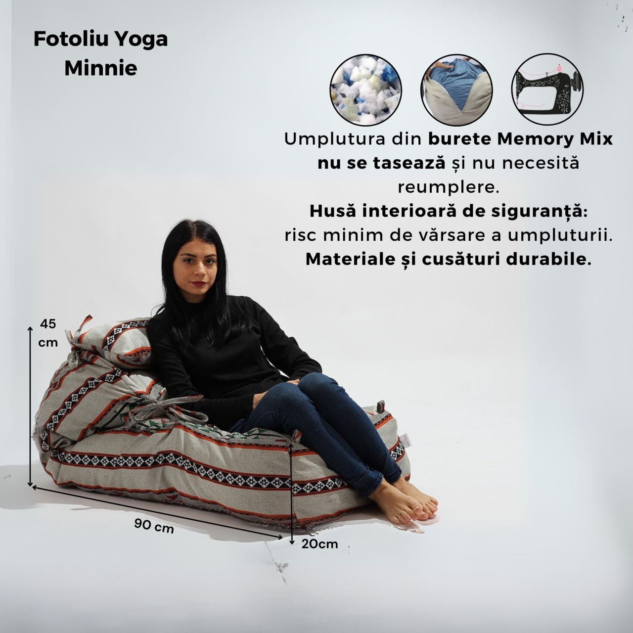 Fotoliu Yoga Minnie – fotoliu puf compact pe burete memory mix Fotoliul Yoga Minnie – Pufrelax este varianta compactă din gama Yoga. Flexibil și versatil, poate fi folosit ca fotoliu, șezlong sau ca un spătar confortabil de rezemat. Structura pe burete memory mix oferă susținere fermă și confort constant. De ce să alegi acest model? Compact și flexibil – se adaptează la orice poziție Dimensiuni compacte – 90 × 55 × 45 cm, ideal pentru spații mici Structură pe burete memory mix – susținere fermă, stabilă, își păstrează forma în timp Husă detașabilă și lavabilă – se spală la mașina de spălat la 30°C Nu necesită completare – buretele își păstrează proprietățile Fabricat în România – produs Pufrelax, materiale premium și cusături durabile Specificații Dimensiuni: aproximativ 90 × 55 × 45 cm Dimensiuni extinse: aproximativ 150 × 55 × 25 cm Umplutură: fulgi de burete memory mix Material husă: textil, detașabilă și lavabilă Utilizare: interior Unde se potrivește Yoga Minnie este ideal pentru camera copiilor, dormitor sau orice spațiu compact. Se adaptează oricărei poziții de relaxare – perfect pentru citit, vizionat filme sau odihnă. Yoga Minnie este fotoliul compact din gama Yoga Pufrelax, fabricat în România. Burete memory mix, husă lavabilă și dimensiuni compacte – confort flexibil pentru spații mici.