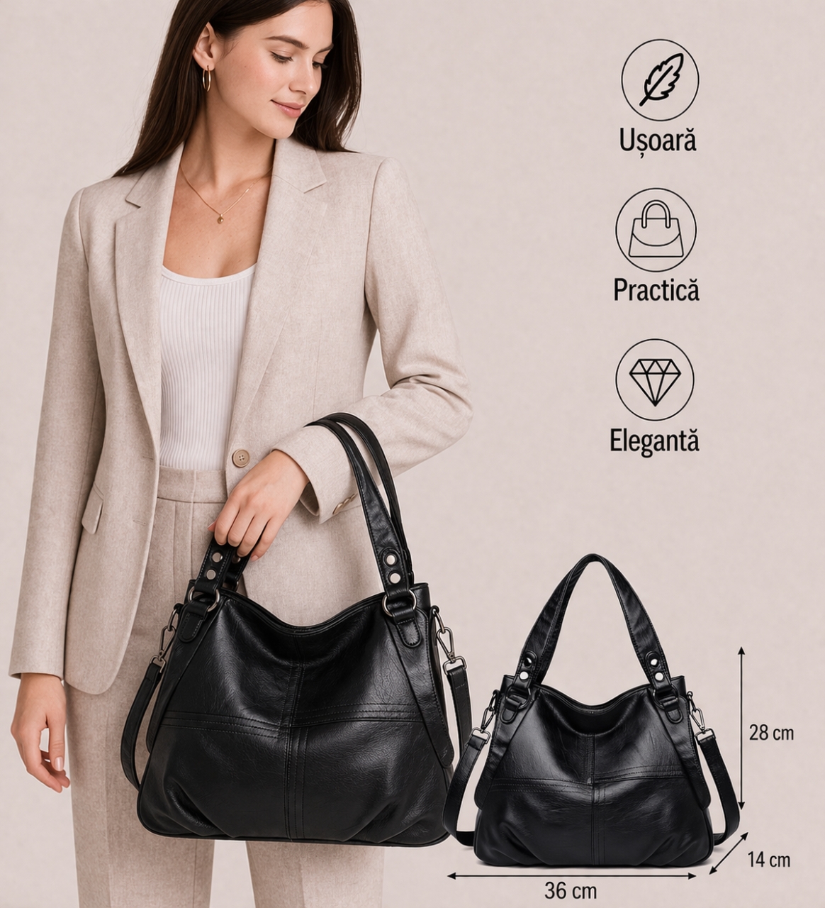 Detalii produs: 2 compartimente principale; interior captusit; 1 buzunar exterior spate cu fermoar; 1 buzunar interior cu fermoar; 1 buzunar interior fara inchidere; bareta ajustabila; 1 bareta ajustabila si detasabila; greutate: 0.9 kg material: piele ecologica; dimensiuni: 36 x 14 x 28 cm. Important: Nuanta produsului poate varia usor, datorita luminozitatii monitorului, datorita varietatilor instrumentelor de masura, pot exista usoare erori de cm!