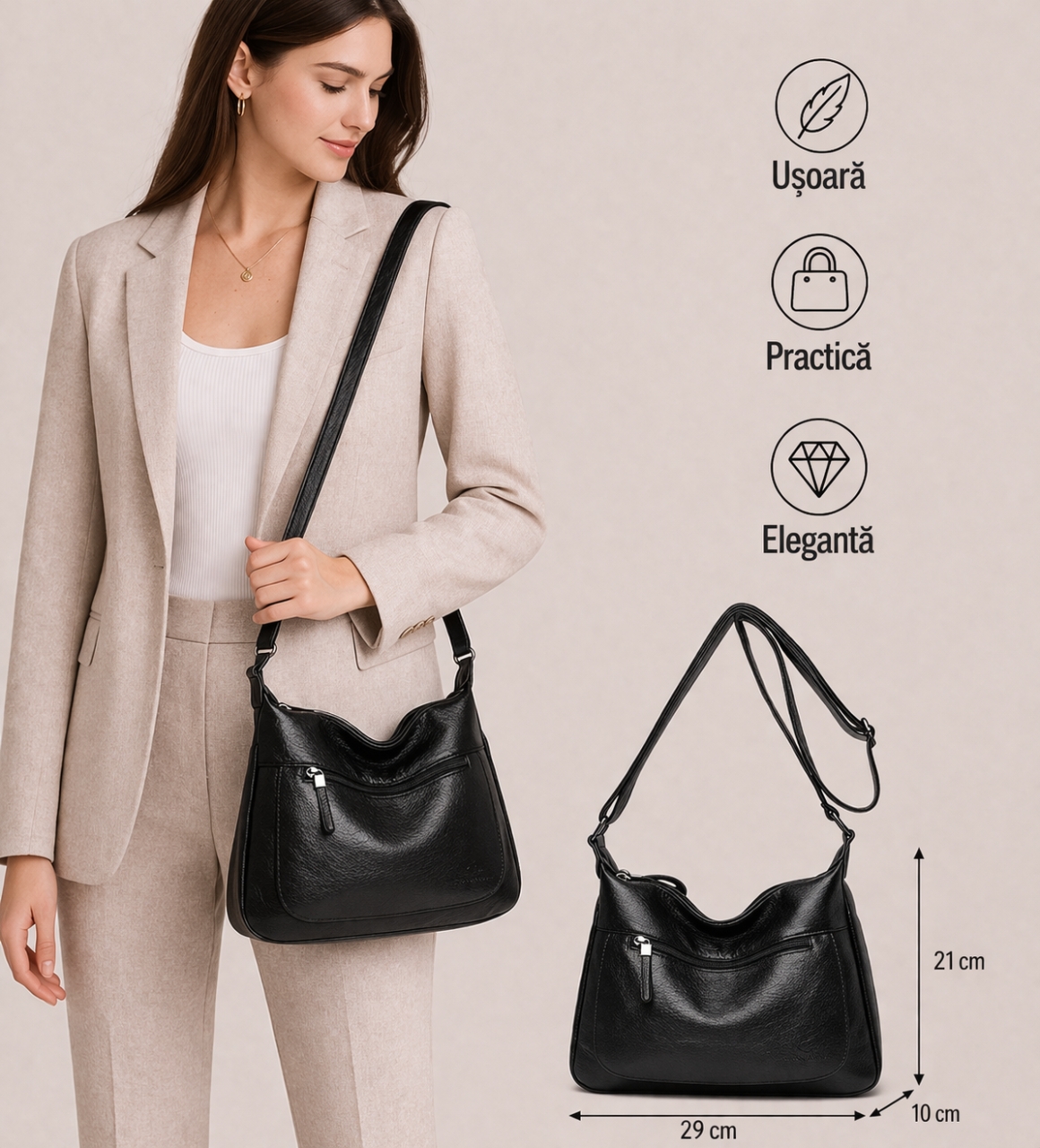 Detalii produs: 2 compartimente principale; 1 buzunar interior fara inchidere; 1 buzunar exterior spate cu fermoar; 1 buzunar exterior fata cu fermoar; 1 buzunar interior cu fermoar; material: piele ecologica; interior captusit; bareta ajustabila; dimensiuni: 29 x 10 x 21 cm. Important: Nuanta produsului poate varia usor, datorita luminozitatii monitorului, datorita varietatilor instrumentelor de masura, pot exista usoare erori de cm!