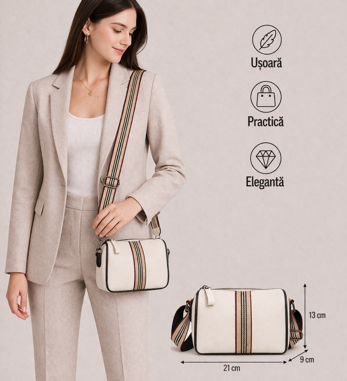 Detalii produs: interior captusit; 1 compartiment principal; 1 buzunar exterior spate cu fermoar; bareta ajustabila pentru umar; material: piele naturala; greutate: 0.35 kg; dimensiuni: 21 x 9 x 13 cm. Important : Culoarea produsului poate varia ușor datorită luminozității monitorului. Din cauza varietății instrumentelor de măsură, pot exista ușoare erori de cm.