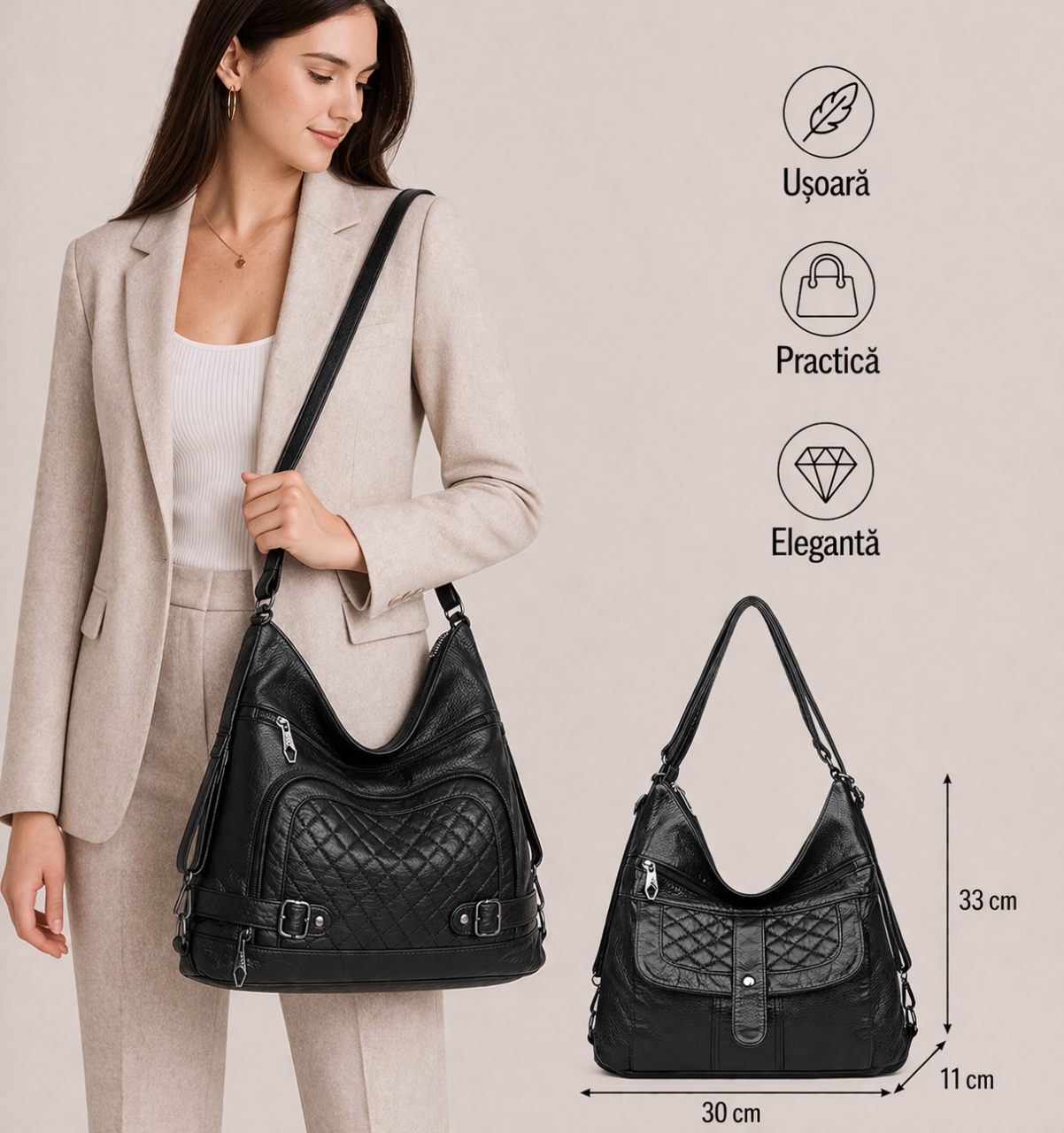 Detalii produs: 2 compartimente principale; 1 buzunar exterior spate cu fermoar; 1 buzunar interior cu fermoar; 2 buzunare exterioare fata; material: piele ecologica; bareta ajustabila; greutate: 0.52 kg; dimensiuni: 30 x 11 x 33 cm. Important: Nuanta produsului poate varia usor, datorita luminozitatii monitorului, datorita varietatilor instrumentelor de masura, pot exista usoare erori de cm!
