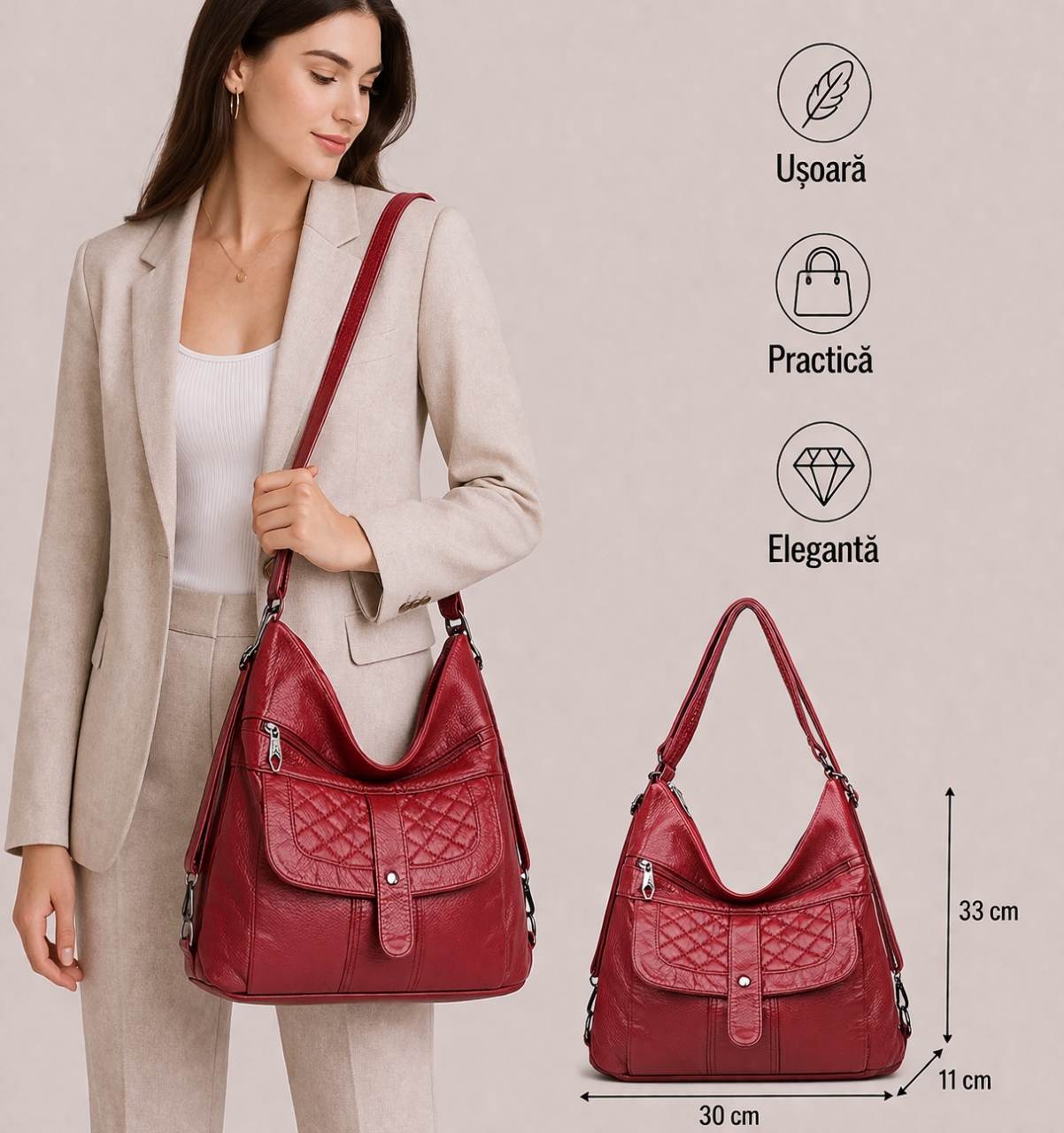 Detalii produs: 2 compartimente principale; 1 buzunar exterior spate cu fermoar; 1 buzunar interior cu fermoar; 2 buzunare exterioare fata; material: piele ecologica; bareta ajustabila; greutate: 0.52 kg; dimensiuni: 30 x 11 x 33 cm. Important: Nuanta produsului poate varia usor, datorita luminozitatii monitorului, datorita varietatilor instrumentelor de masura, pot exista usoare erori de cm!