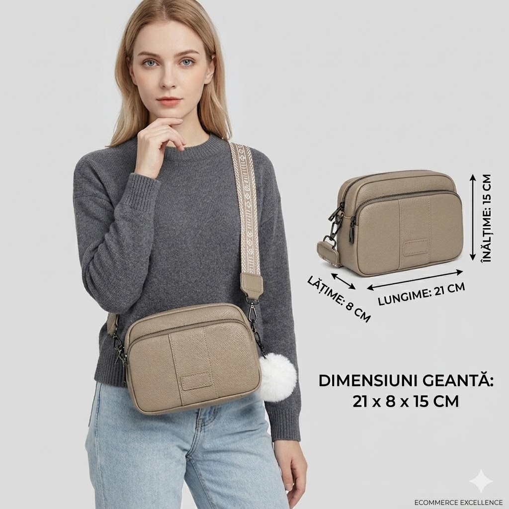 Moale, confortabilă și plăcută la atingere, această geantă ușoară vă poate completa cu ușurință ținutele de zi cu zi și va arată grozav indiferent de ocazie. O geanta atat de versatila de care va veti indragosti la prima vedere. interior captusit; 1 compartiment principal; 1 buzunar interior cu fermoar; 1 buzunar interior fara inchidere; 1 buzunar exterior fata cu fermoar; 1 buzunar exterior spate cu fermoar; bareta ajustabila si detasabila; material: piele naturala; greutate: 0.3 kg; dimensiuni: 21 x 8 x 15 cm; accesorii de culoare argintie; sistem inchidere: fermoar. Curatare : Ștergeți cu o cârpă umedă. Important: Nuanta produsului poate varia usor, datorita luminozitatii monitorului, datorita varietatilor instrumentelor de masura, pot exista usoare erori de cm!