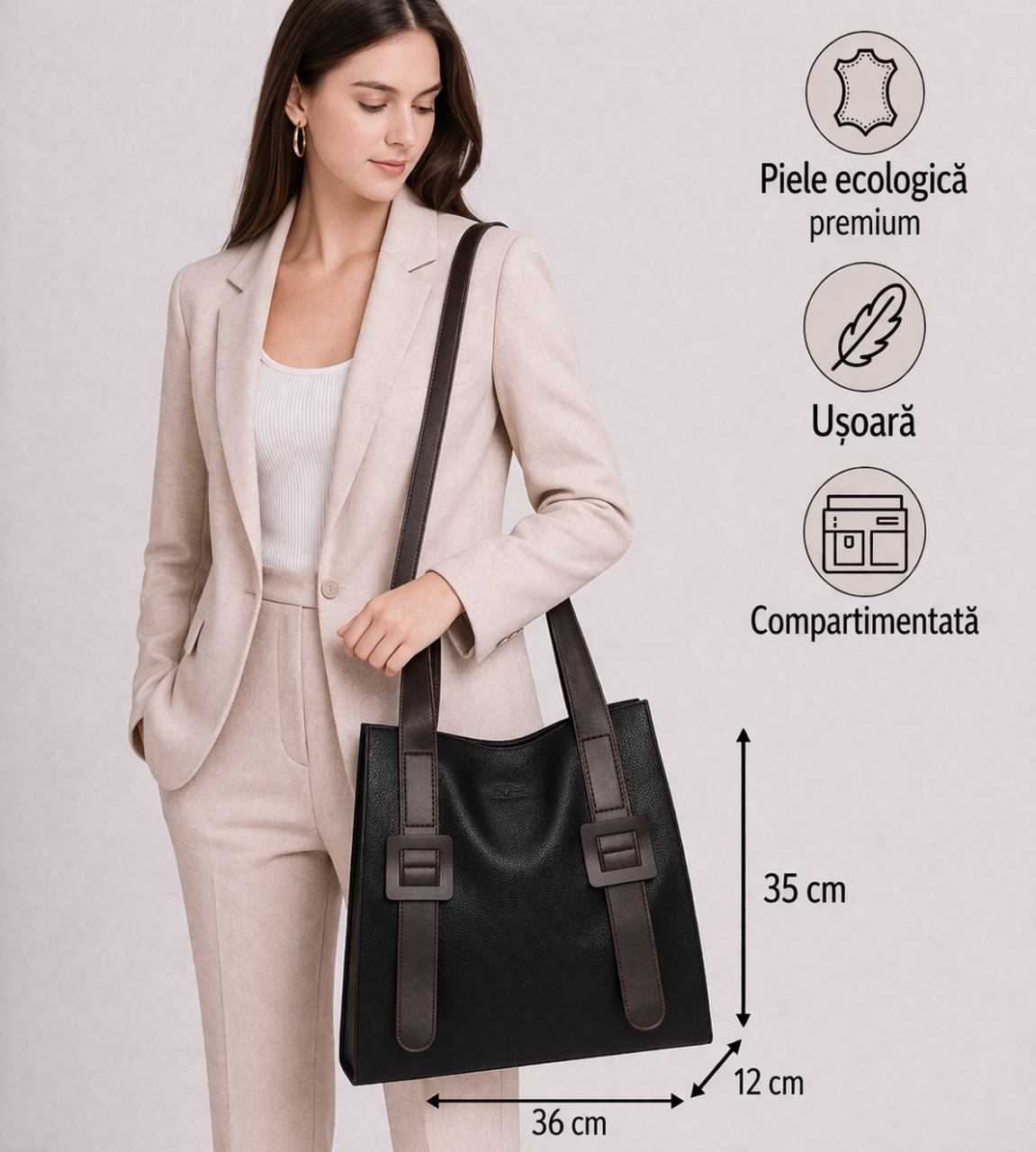 Detalii produs: interior captusit; 1 compartiment principal; 2 buzunare interioare cu fermoar; 1 buzunar interior fara inchidere; 1 buzunar exterior spate cu fermoar; material: piele ecologica; dimensiuni: 36 x 12 x 35 cm. Important : Culoarea produsului poate varia ușor datorită luminozității monitorului. Din cauza varietății instrumentelor de măsură, pot exista ușoare erori de cm.