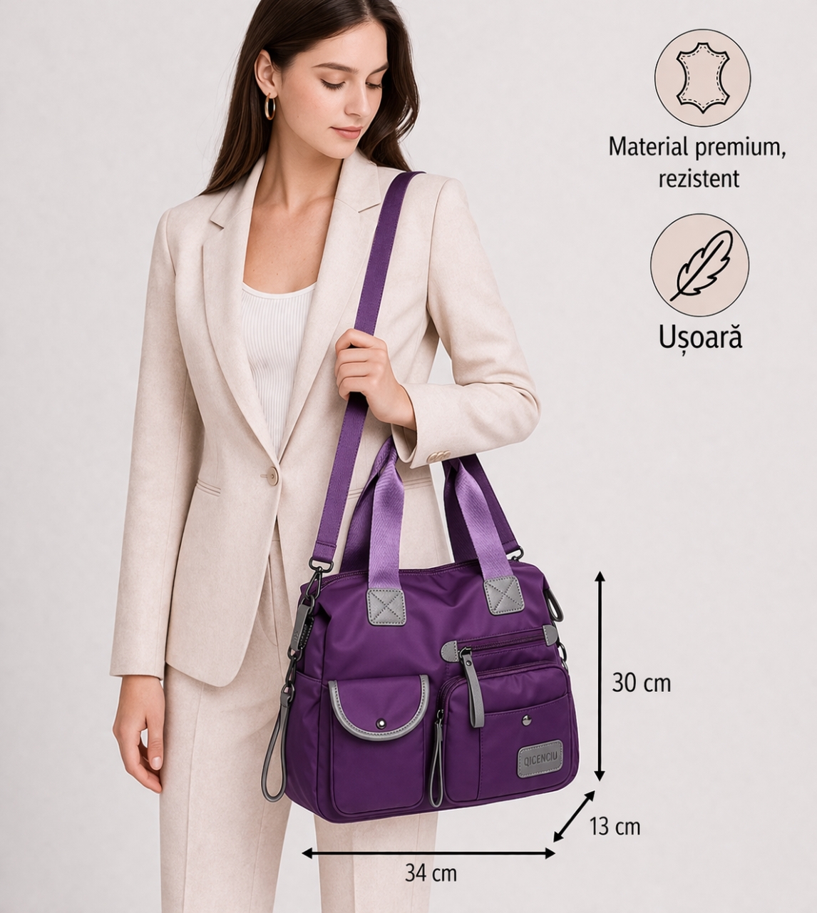 Detalii produs: interior captusit; 1 compartiment principal; 1 buzunar interior cu fermoar; 2 buzunare interioare fara inchidere; 1 buzunar exterior spate cu fermoar; 2 buzunare laterale fara inchidere; 2 buzunare exterioare fata cu fermoar; 2 buzunare exterioare fata cu capsa; 1 bareta ajustabila si detasabila; material: poliester impermeabil; dimensiuni: 34 x 13 x 30 cm. Important : Culoarea produsului poate varia ușor datorită luminozității monitorului. Din cauza varietății instrumentelor de măsură, pot exista ușoare erori de cm.
