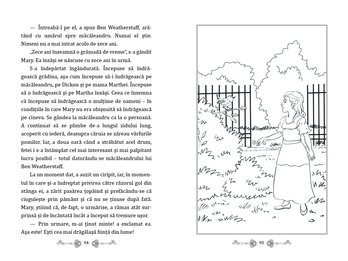 Această capodoperă a literaturii universale rămâne o poveste atemporală despre prietenie, curaj și redescoperirea frumuseții vieții. Povestea urmărește transformarea lui Mary Lennox, o fetiță orfană, egoistă și singuratică, care ajunge să trăiască la Conacul Misselthwaite, o casă misterioasă înconjurată de o natură sălbatică. Descoperirea unei grădini secrete, neglijate și încuiate de ani de zile, devine punctul de plecare al unei călătorii emoționante spre schimbare și vindecare. Alături de prietenii săi, Dickon și Colin, Mary readuce la viață grădina, învățând lecții valoroase despre puterea naturii și a legăturilor umane. Această ediție îmbină frumusețea limbajului clasic cu ilustrații fermecătoare, care redau magia locurilor descrise. Cartea este o alegere ideală pentru cititori de toate vârstele, fiind o poveste captivantă pentru copii și o lectură nostalgică pentru adulți. Grădina secretă este un omagiu adus puterii transformatoare a naturii și frumuseții prieteniei. Redescoperă bucuria copilăriei prin paginile acestei povești inegalabile! Caracteristici: Autori: Frances Hodgson Burnett Pagini: 432 Mărimi: 14*21 Copertă: Necartonată Vârstă: 7 ani +