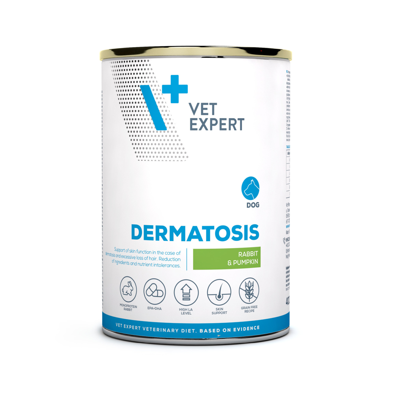 Dieta veterinară umedă, pentru câini adulți, Vet Expert Dermatosis, Iepure și Dovleac, 400g