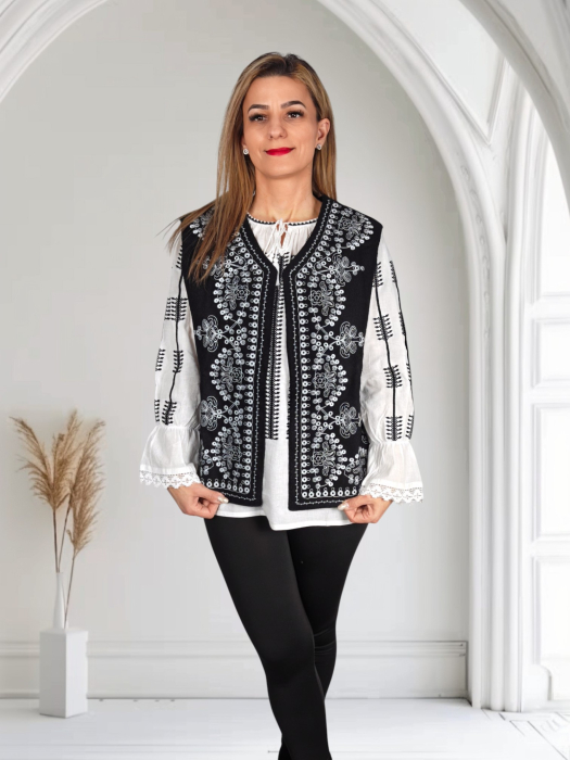 Ie din panza de bumbac 100%. Broderie cusuta la masina. Culoare: alb cu broderie auriu Marimi disponibile: S -100cm circumferinta bustului, 65 cm lungime, M -105cm circumferinta bustului, 65 cm lungime, L , 110cm circumferinta bustului, 66 cm lungime,...
