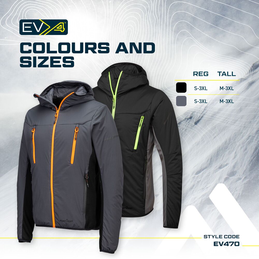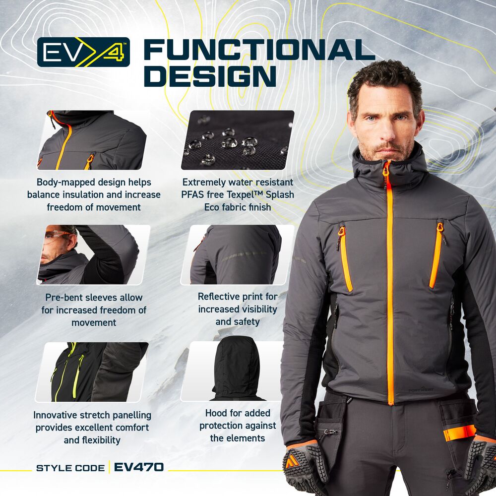 Portwest EV470 – Jacheta Hybrid EV4, izolata, elastica, body‑mapped si cu captuseala Insulatex Pro Portwest EV470 este o jacheta hibridă ce combină panouri termoizolante cu zone elastice pentru mobilitate ridicată. Structura body‑mapped menține căldura în zona trunchiului, iar panourile laterale și de sub braț permit mișcări ample. Este ușoară, rezistentă la apă și ideală pentru activități dinamice în sezon rece. Utilizare Muncă outdoor în sezon rece. Service, intervenții, logistică. Activități care necesită mobilitate + izolare. Caracteristici tehnice Design body‑mapped pentru echilibru între izolație și mișcare. Panouri elastice pentru mobilitate și flexibilitate. Captuseală Insulatex Pro – căldură fără volum în exces. Glugă cu ajustare. 4 buzunare cu fermoar. Mansete și tiv elastic. Material rezistent la apă cu finisaj Texpel Splash Eco. ActiReach – mobilitate superioară în brațe. Materiale TesaturaTitanmill Ultra Ripstop Stretch CaptusealăNylon IzolațieInsulatex Pro (poliester) FAQ Este potrivită pentru temperaturi scăzute? – Da, izolează foarte bine zona pieptului și spatelui. Permite mișcări ample? – Da, structura elastică și ActiReach ajută mult.