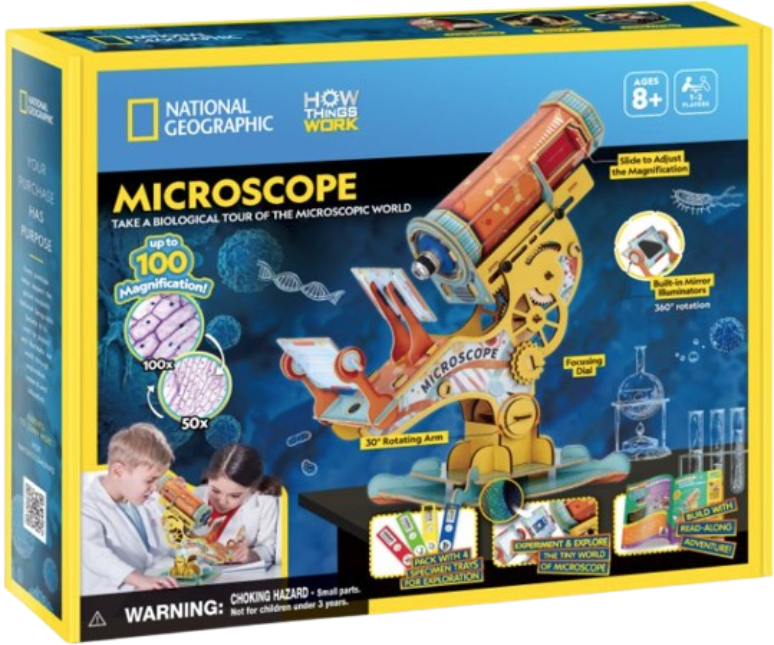 Aceasta experienta interactiva nu doar ca va trezi curiozitatea copiilor, dar le va si imbunatati intelegerea structurilor celulare si a organismelor microscopice. Brosura cu informatii despre optica: cu acest kit de microscop, copiii pot explora lumea microscopica si pot invata despre principiile opticii si maririi. Marire de pana la 100 de ori! Setul include 4 tavi cu probe pentru explorare. In plus, stii cum arata o frunza la o marire de 100 de ori? Incearca sa descoperi si sa observi mai multe obiecte din viata de zi cu zi cu ajutorul acestui microscop! Ce contine kitul? Puzzle 3D STEM „Construieste singur” – Un joc creativ de constructie pentru minti curioase si exploratori ambitiosi. Carte educativa plina de informatii – Ilustratii captivante, explicatii accesibile si fapte interesante. Ghid pas cu pas pentru asamblare – Descopera mecanismele interne in timp ce construiesti modelul tau 3D. Caracteristici produs: Jucarii STEM Usor de asamblat Nu sunt necesare unelte Fara lipici Antreneaza perceptia spatiala Jocuri de familie Distractie educativa Cum asamblezi puzzle-ul? Urmeaza instructiunile din brosura pentru a construi modelul pas cu pas. Fiecare piesa este numerotata pentru a usura procesul de asamblare. Recomandam perforarea usoara a gaurilor interconectate inainte de montare. Scoate doar piesele necesare pentru fiecare pas, astfel incat numerotarea sa ramana vizibila. Sfaturi utile: Asambleaza cu rabdare, fara a forta piesele. Fiecare piesa are doua fete si se poate indoi doar intr-o singura directie – asigura-te ca partea corecta este orientata spre exterior. Nu folosi unelte precum cutite sau foarfeci si nu lipi piesele intre ele.