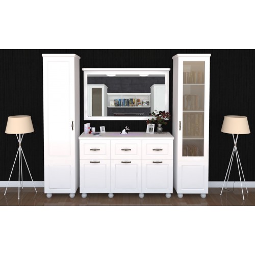 Dynasty este o alegere eleganta si practica pentru living-ul dumneavoastra. Usile si fetele de sertar sunt fabricate din MDF alb cu grosimea de 18 mm si sunt frezate pentru un aspect deosebit. Sticla de la vitrina este fumurie. Manerele metalice antichizate impreuna cu picioarele din lemn vopsit ofera de asemenea o eleganta aparte. Capacele comodelor si ornamentele din partea superioara a dulapurilor sunt fabricate din MDF alb cu grosimea de 25 mm pentru o rezistenta sporita, dar si pentru un aspect placut. Carcasele corpurilor sunt fabricate din PAL melaminat alb cu grosimea de 16 mm. Latimea totala a livingului este de 234 cm, adancimea este de 48 cm, iar inaltimea este de 216 cm. Piesele care formeaza livingul sunt (latime x inaltime x adancime): Dulap cu 1 usa (480 x 2161 x 471 mm), Comoda cu 3 usi si 3 sertare (1380 x 905 x 480 mm), Oglinda (1380 x 100 mm) si Vitrina cu 1 usa (480 x 2161 x 471 mm). Vitrina cu 1 usa si dulapul cu 1 usa au in interior cate 5 spatii de depozitare pe polite. Oglinda include in accesorii sistemele de prindere in perete, mai putin diblurile care se baga in perete si trebuie achizitionate in functie de tipul peretelui dvs. (beton, rigips, lemn etc.). *Nota: Schita de montaj nu se afla in interiorul coletului intre piesele de mobila. Schita de montaj o sa fie atasata pe spatele facturii.